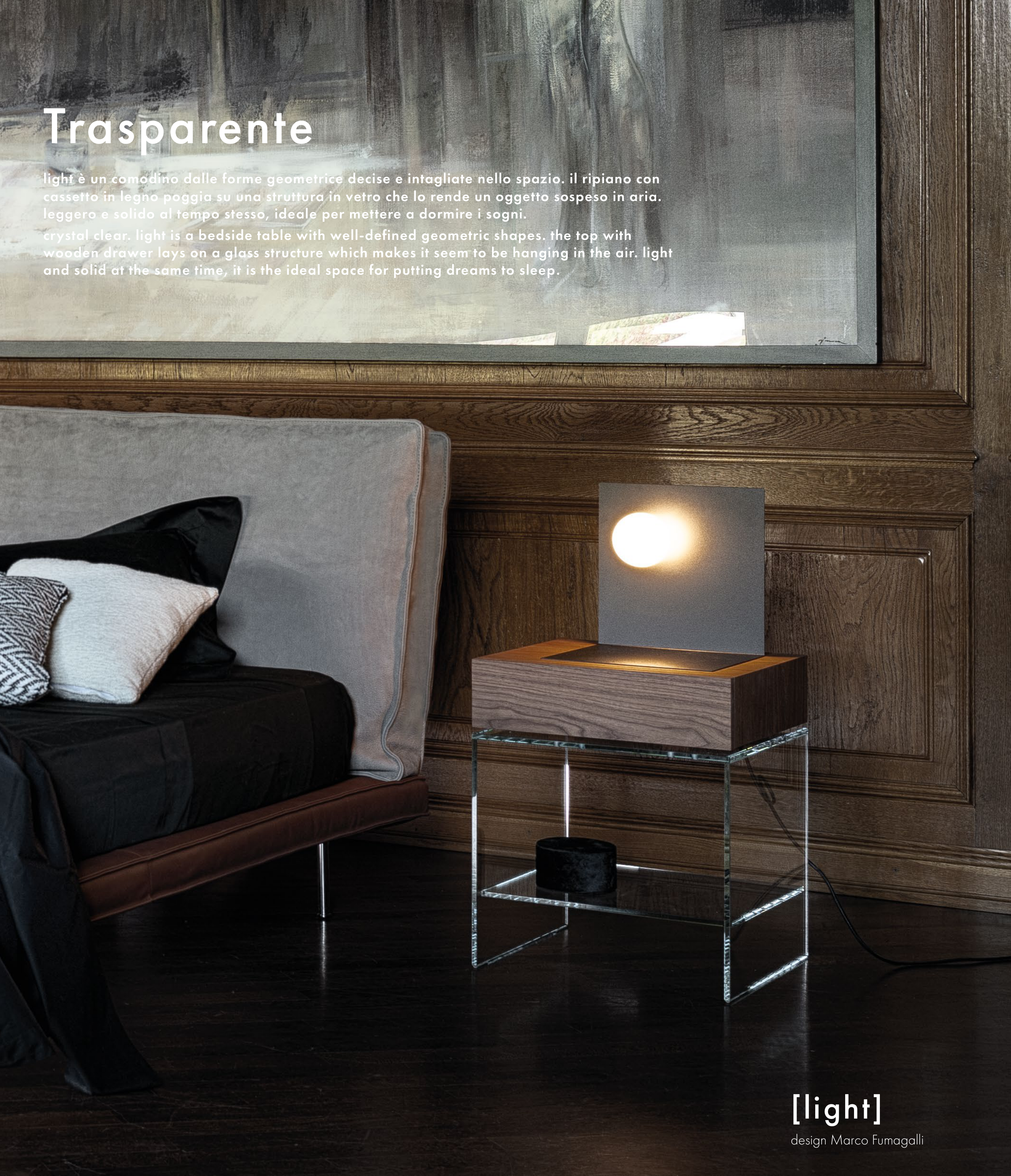 light è un comodino dalle forme geometrice decise e intagliate nello spazio. il ripiano con