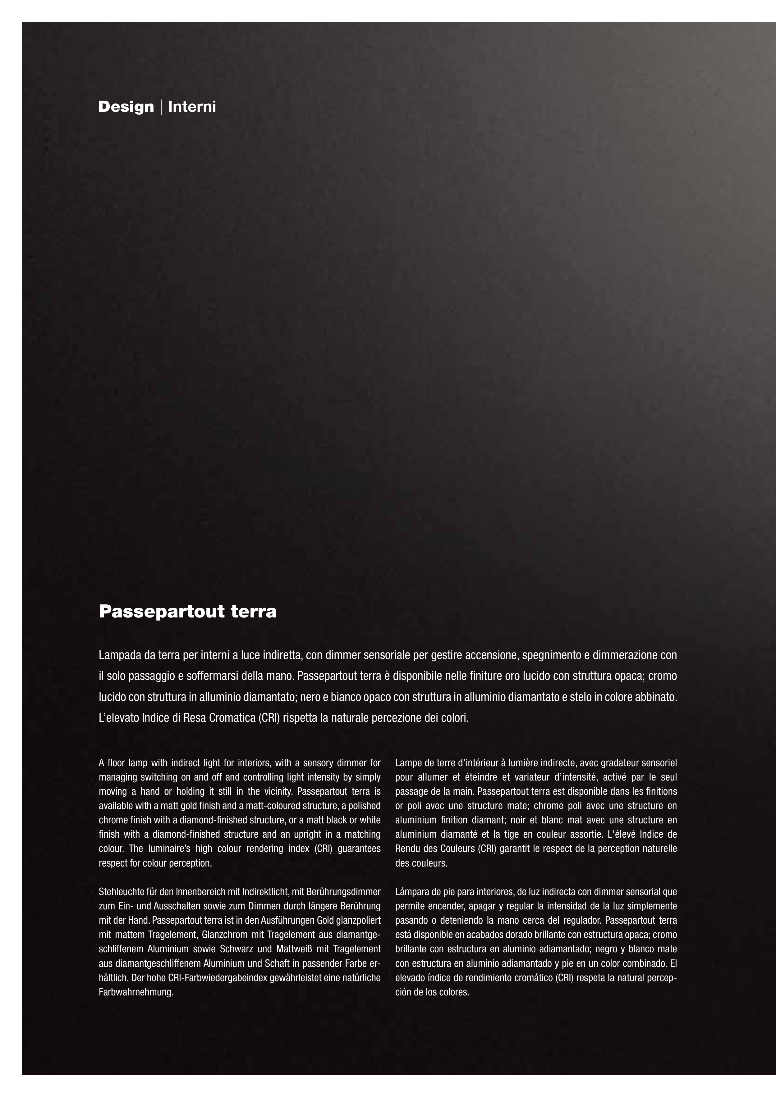 il solo passaggio e soffermarsi della mano. Passepartout terra è disponibile nelle finiture oro lucido con struttura opaca; cromo