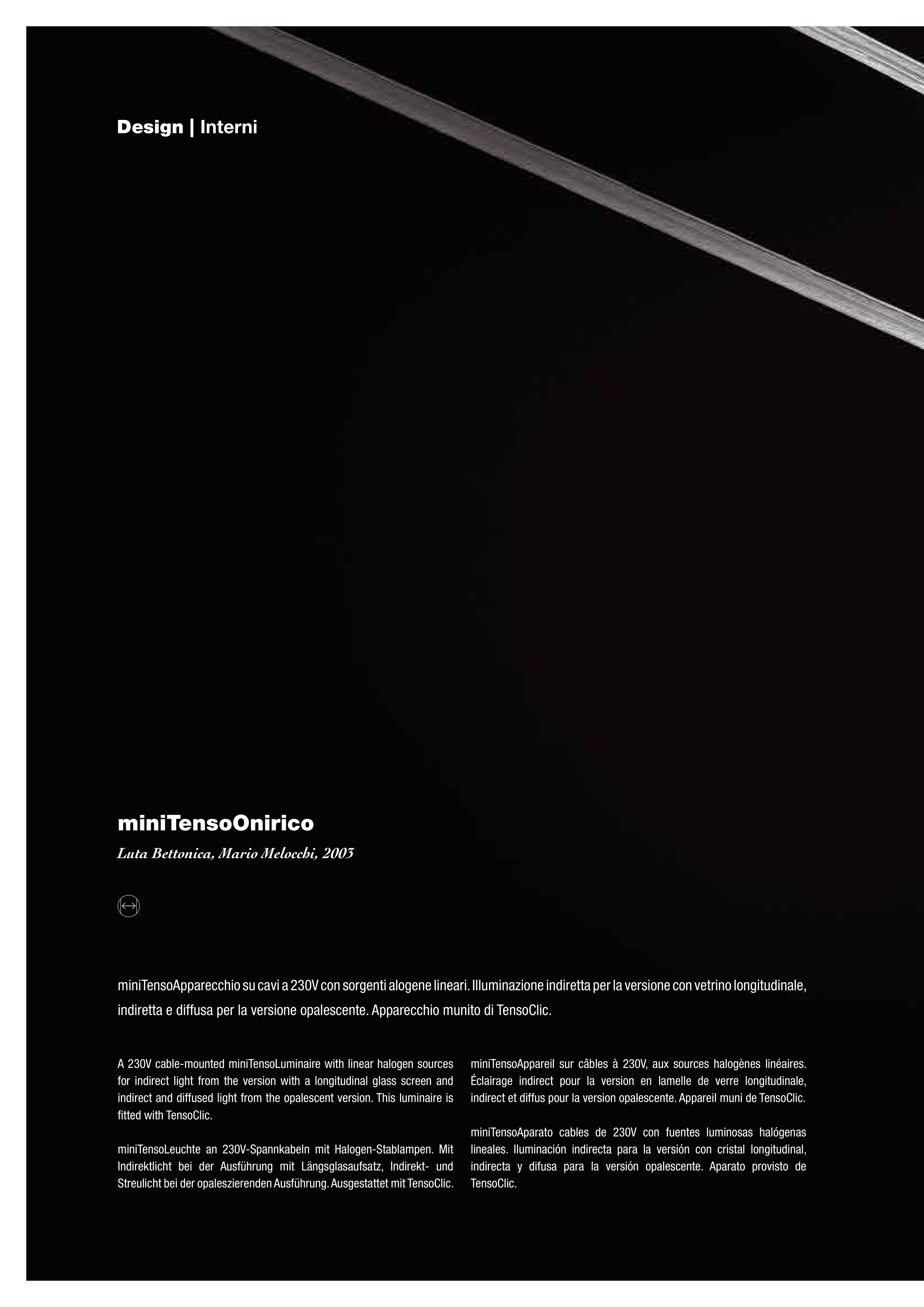 miniTensoApparecchio su cavi a 230V con sorgenti alogene lineari. Illuminazione indiretta per la versione con vetrino longitudinale,
