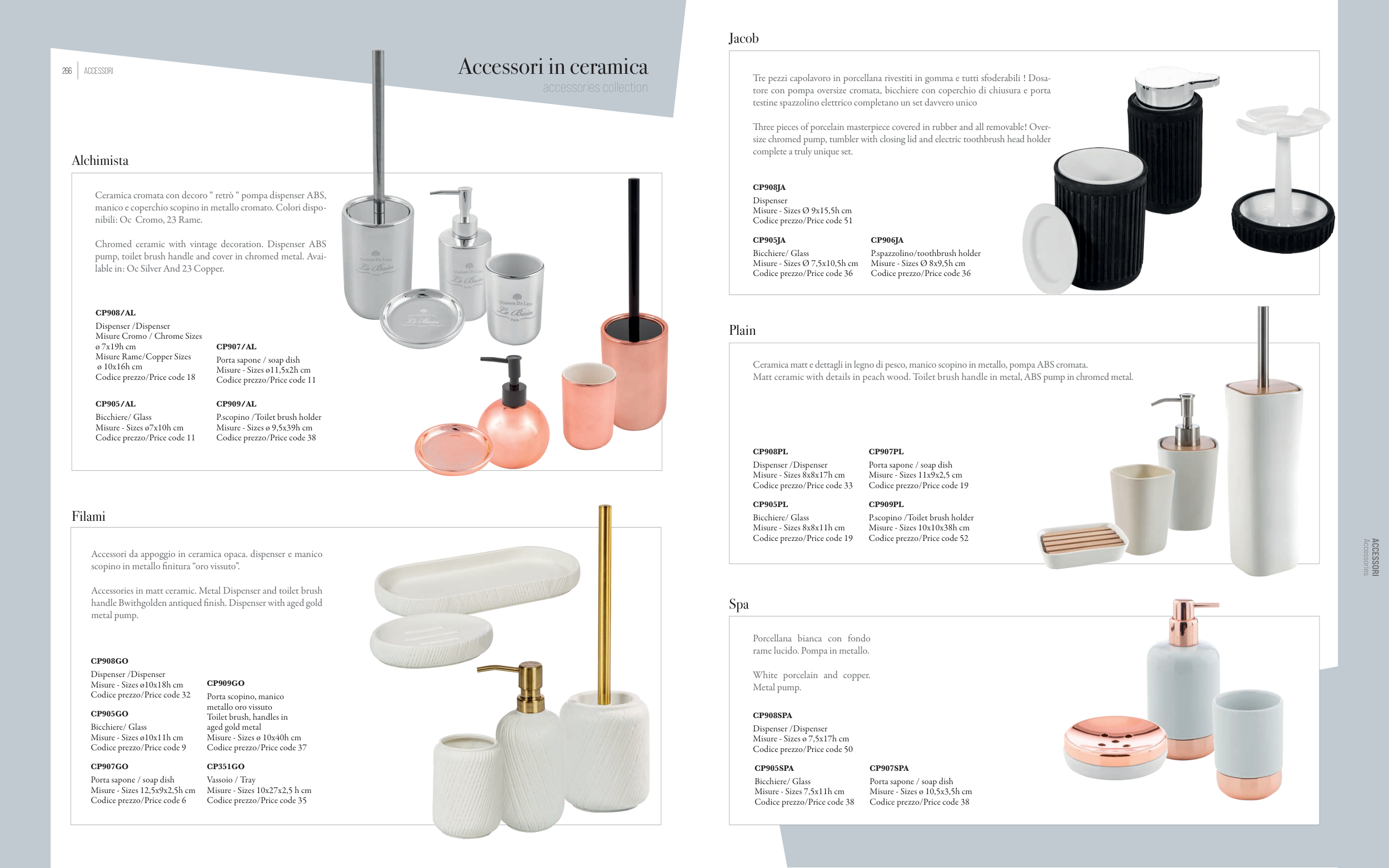 Ceramica matt e dettagli in legno di pesco, manico scopino in metallo, pompa ABS cromata.