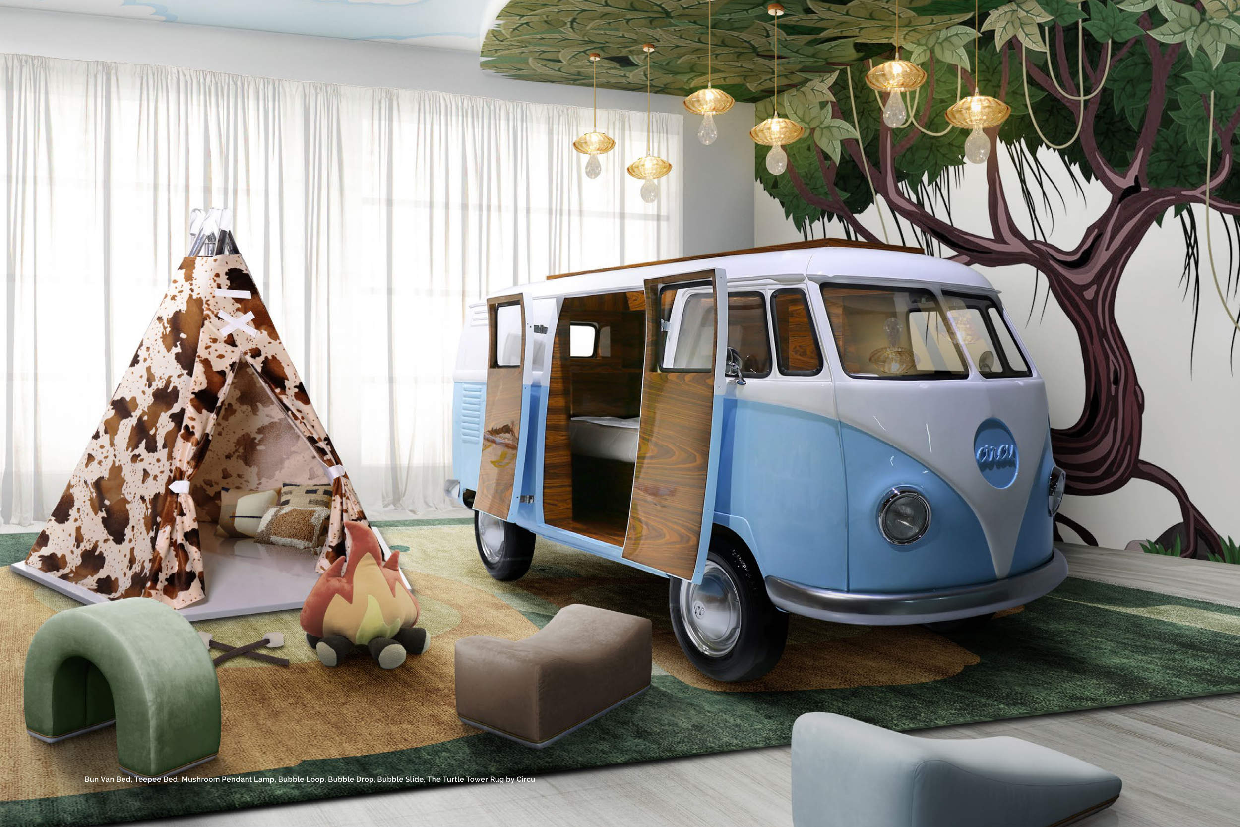 Bun Van Bed, Teepee Bed, Mushroom Pendant Lamp, Bubble Loop, Bubble Drop, Bubble Slide, The Turtle Tower Rug by Circu
