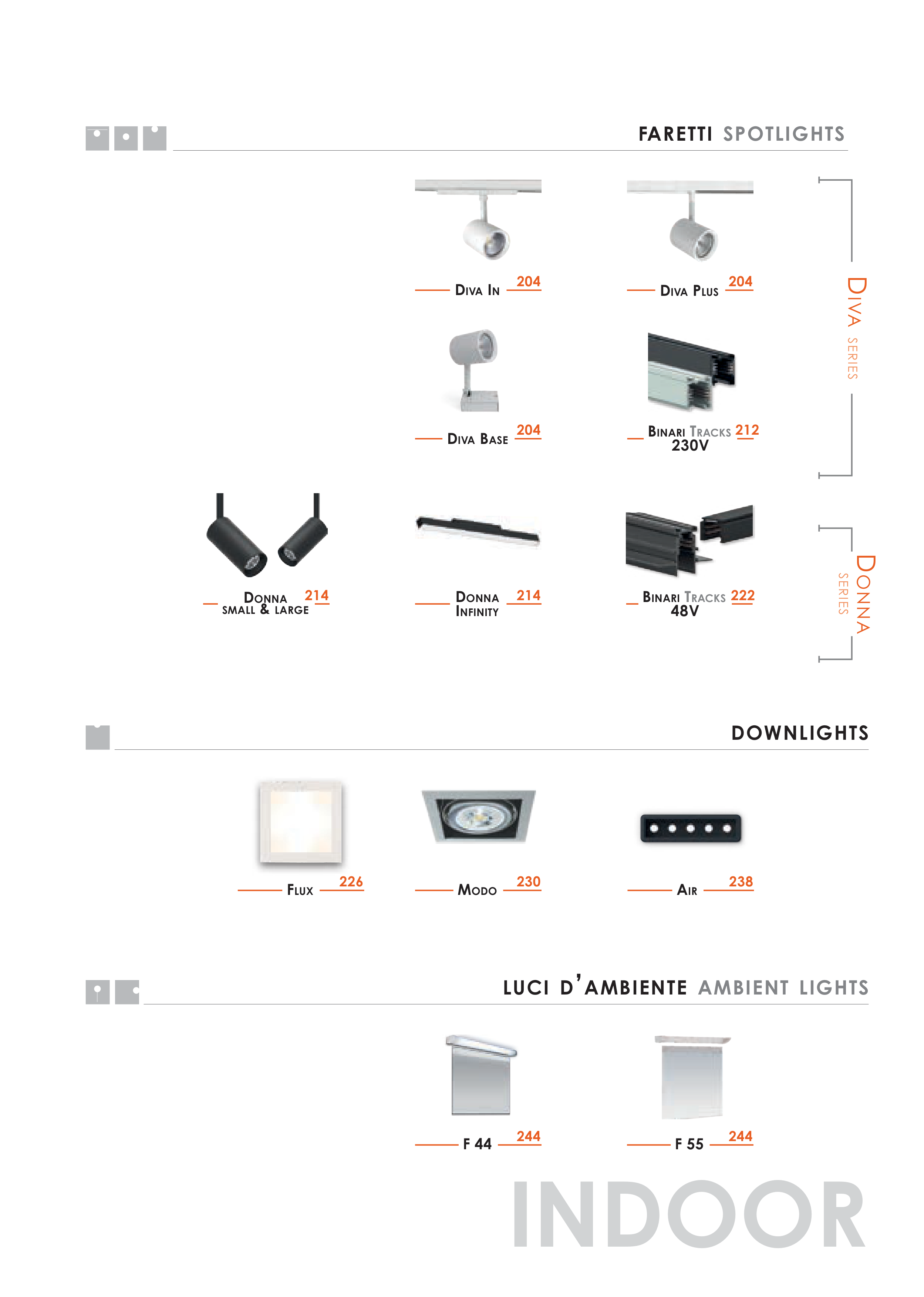 INDOOR DIVA SERIES DONNA SERIES DOWNLIGHTS DIVA IN 204 DONNA INFINITY 214 BINARI TRACKS 230V 212 230 MODO 244 F 44 238 AIR BINARI TRACKS 48V 222 FARETTI SPOTLIGHTS LUCI D’AMBIENTE AMBIENT LIGHTS DIVA PLUS 204 DONNA SMALL & LARGE 214 204 DIVA BASE 226 FLUX 244 F 55