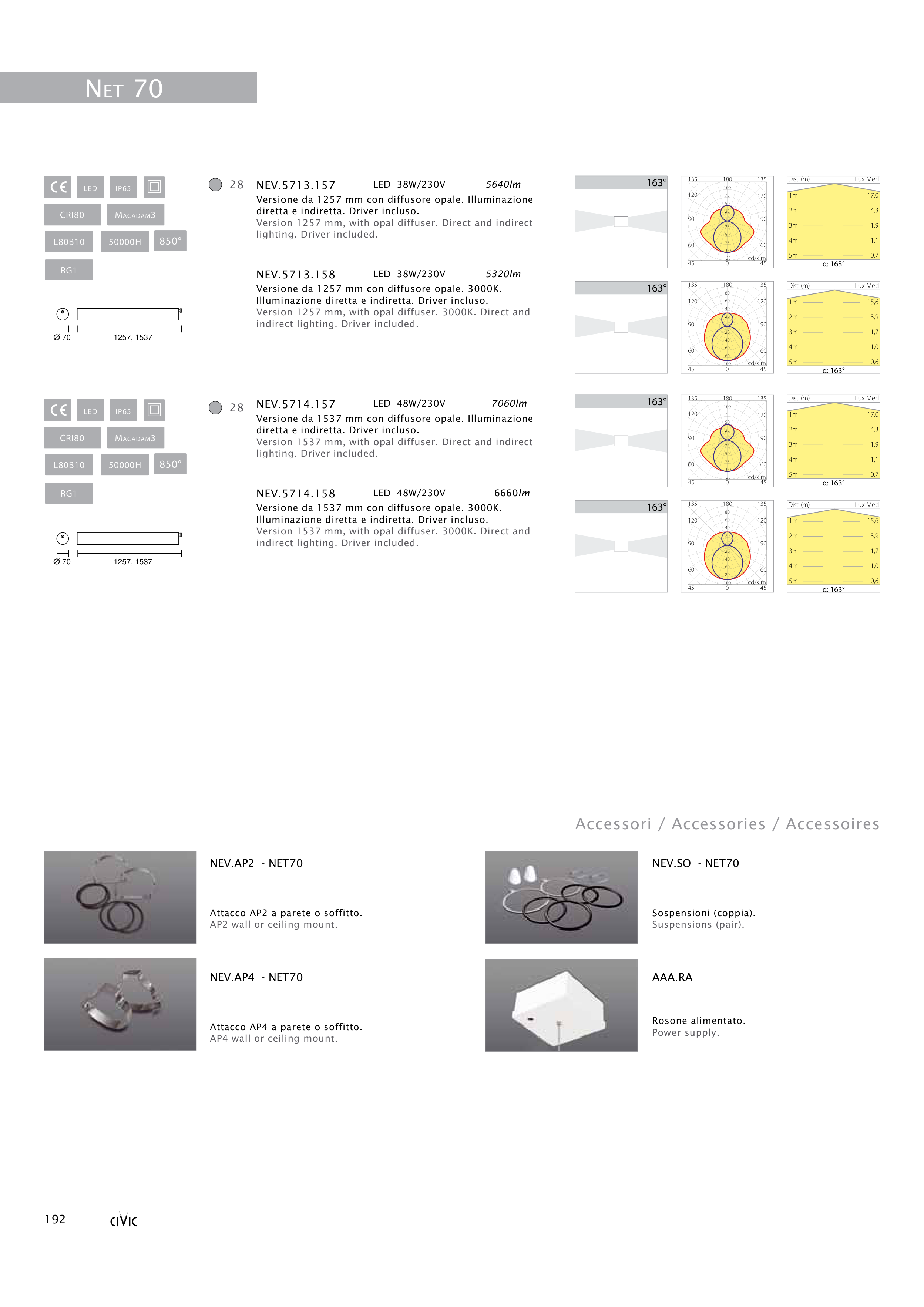 Version 1257 mm, with opal diffuser. 3000K. Direct and