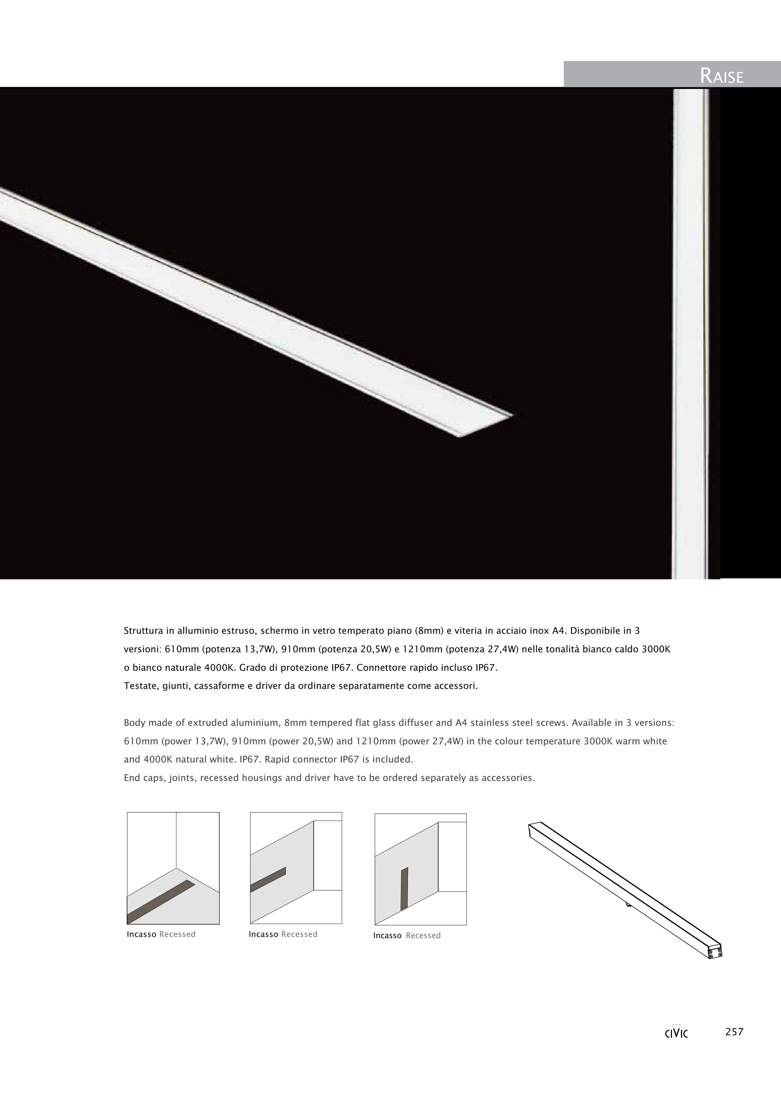 Body made of extruded aluminium, 8mm tempered flat glass diffuser and A4 stainless steel screws. Available in 3 versions: