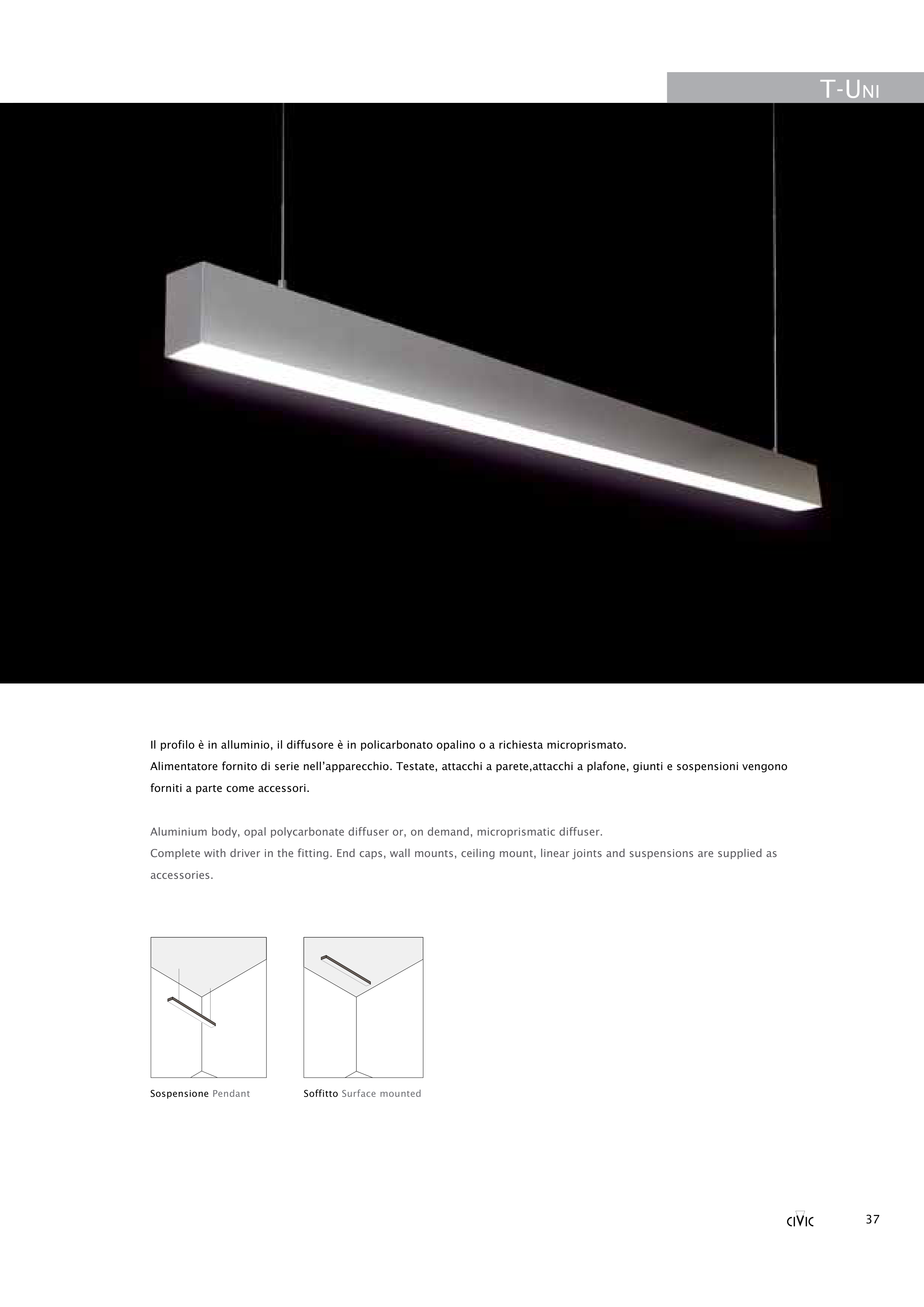Aluminium body, opal polycarbonate diffuser or, on demand, microprismatic diffuser.