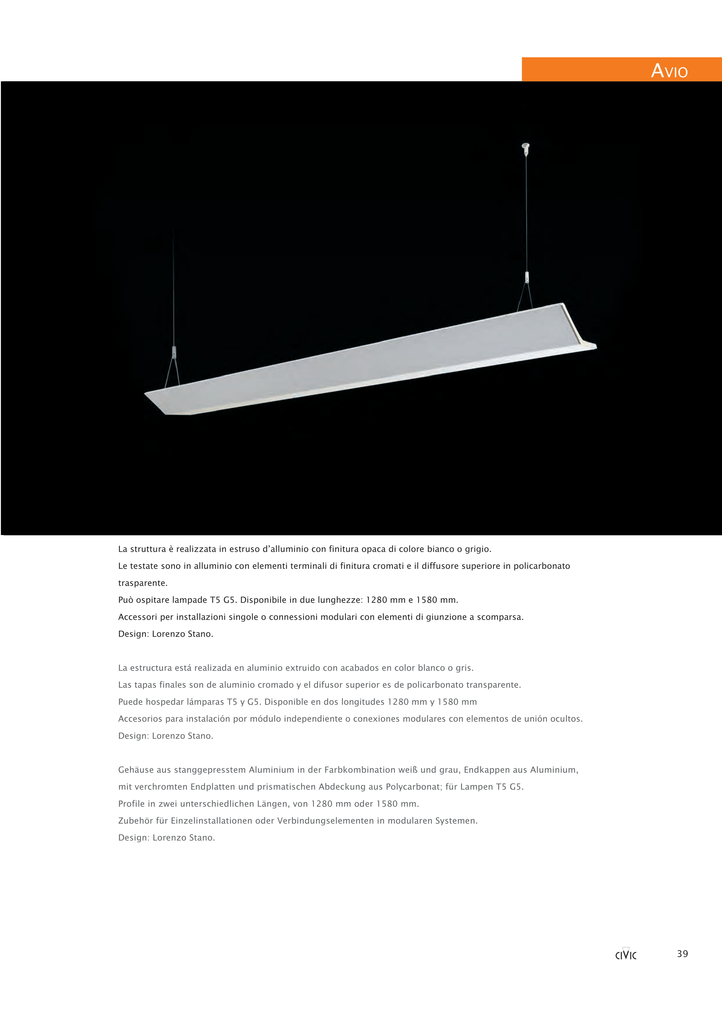 Può ospitare lampade T5 G5. Disponibile in due lunghezze: 1280 mm e 1580 mm.