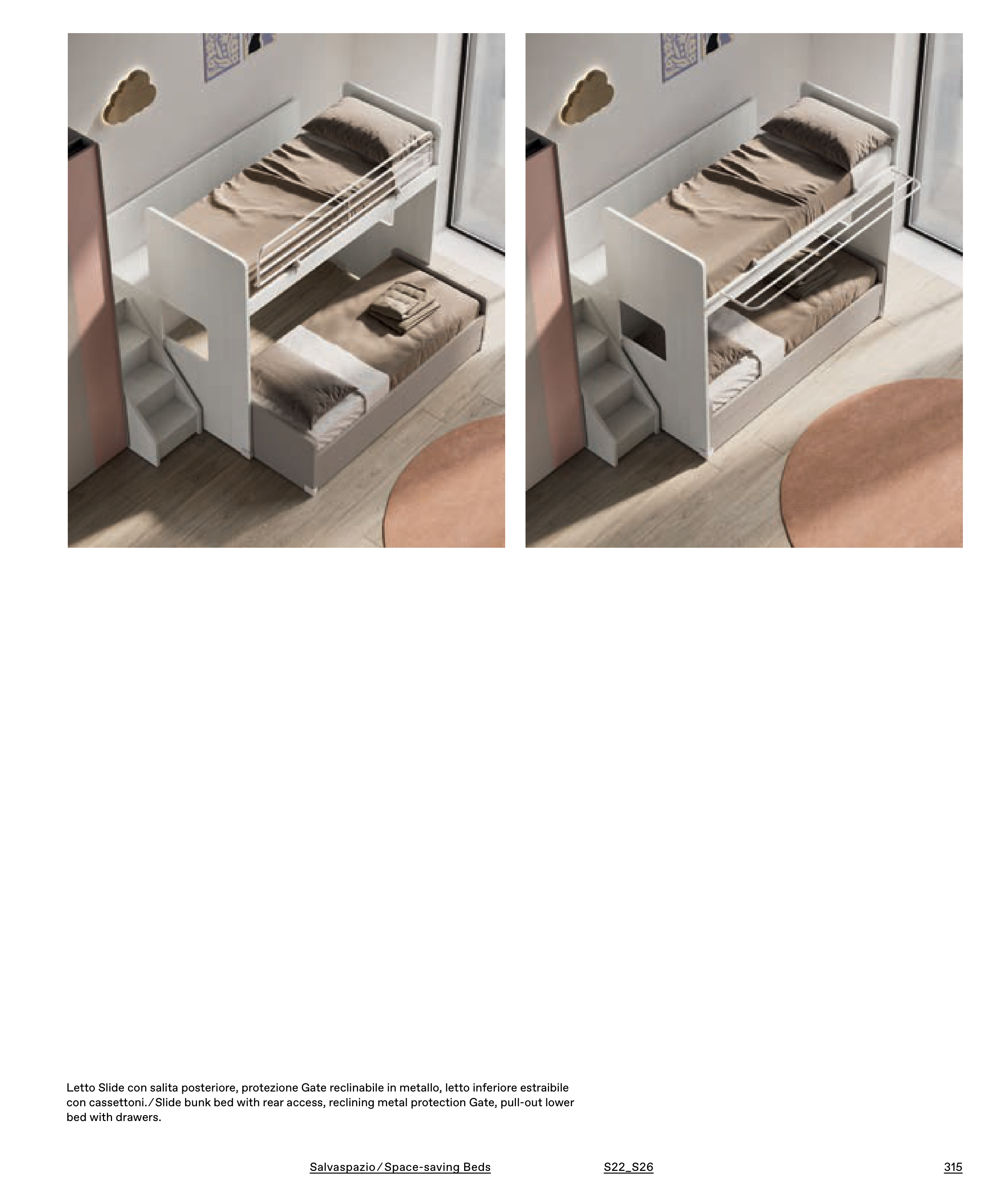 con cassettoni. ⁄ Slide bunk bed with rear access, reclining metal protection Gate, pull-out lower