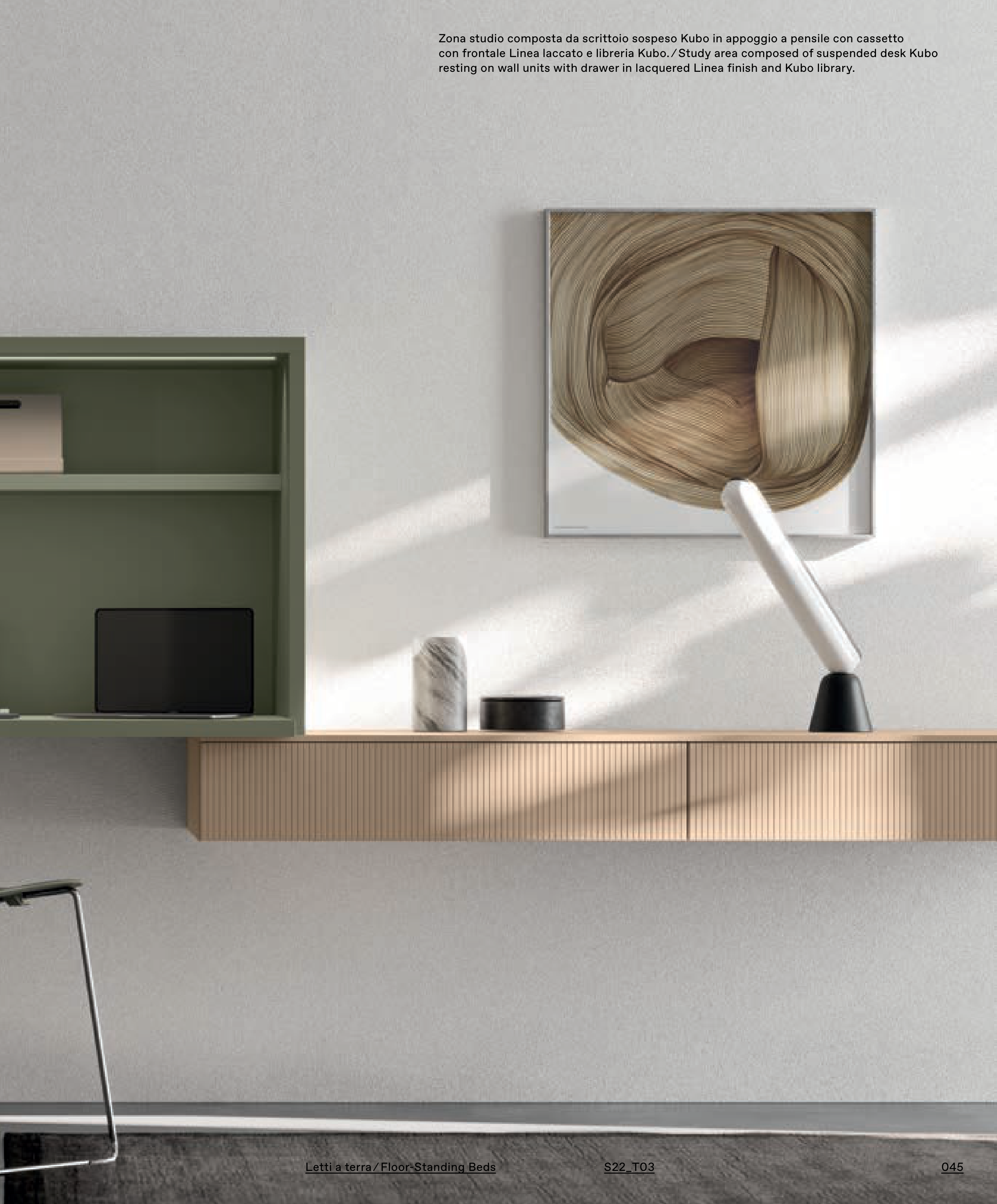con frontale Linea laccato e libreria Kubo. ⁄ Study area composed of suspended desk Kubo