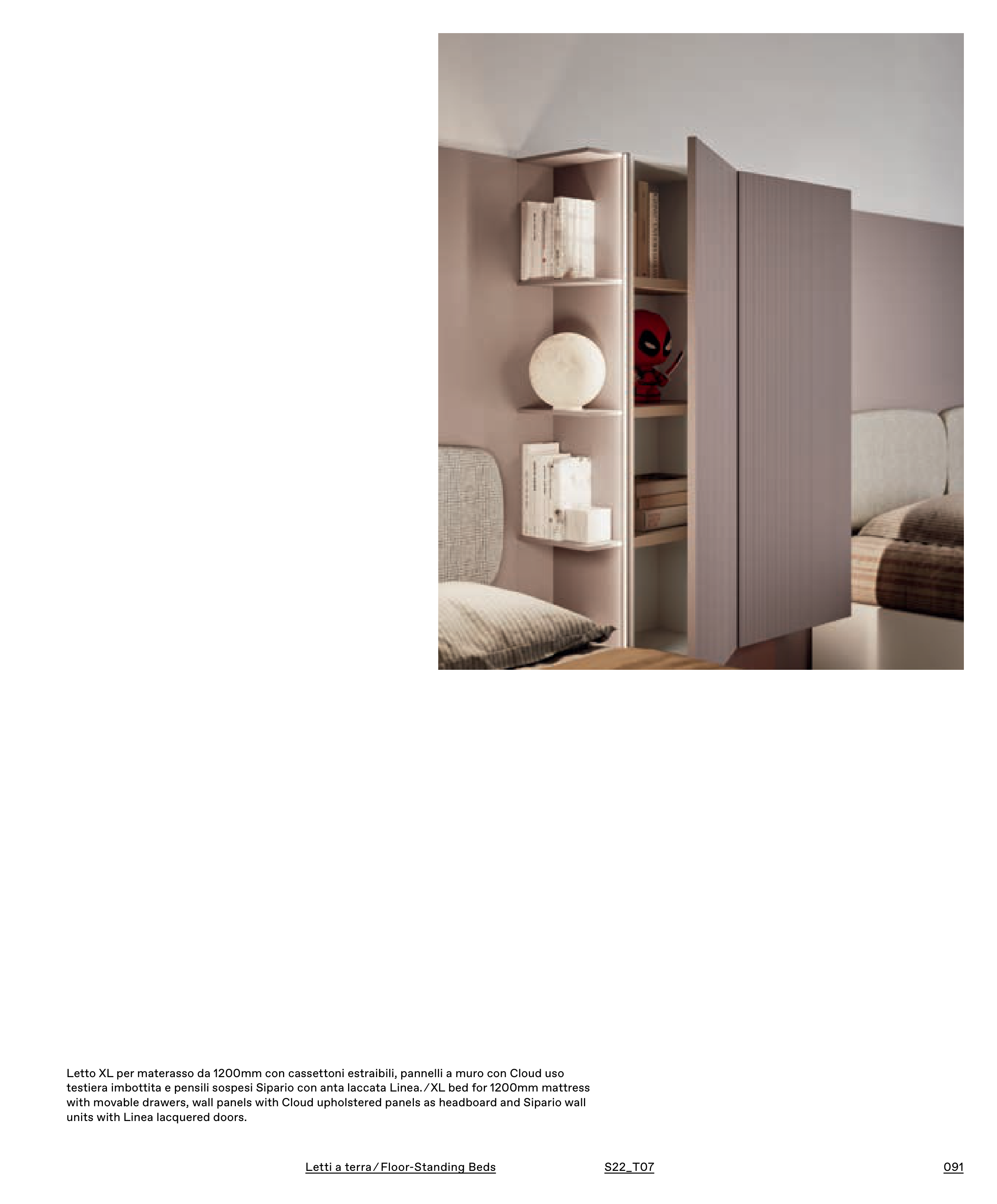 testiera imbottita e pensili sospesi Sipario con anta laccata Linea. ⁄ XL bed for 1200mm mattress