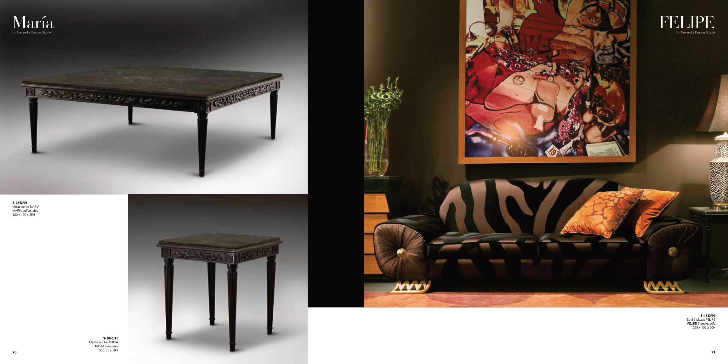 S-1132/01 Sofá 3 plazas FELIPE FELIPE 3-seater sofa 255 x 102 x 90H by Alexandra Design Studio FELIPE María by Alexandra Design Studio S-3846/11 Mesita auxiliar MARÍA MARIA side table 55 x 55 x 59H S-3843/05 Mesa centro MARÍA MARIA coffee table 120 x 120 x 45H 71 70