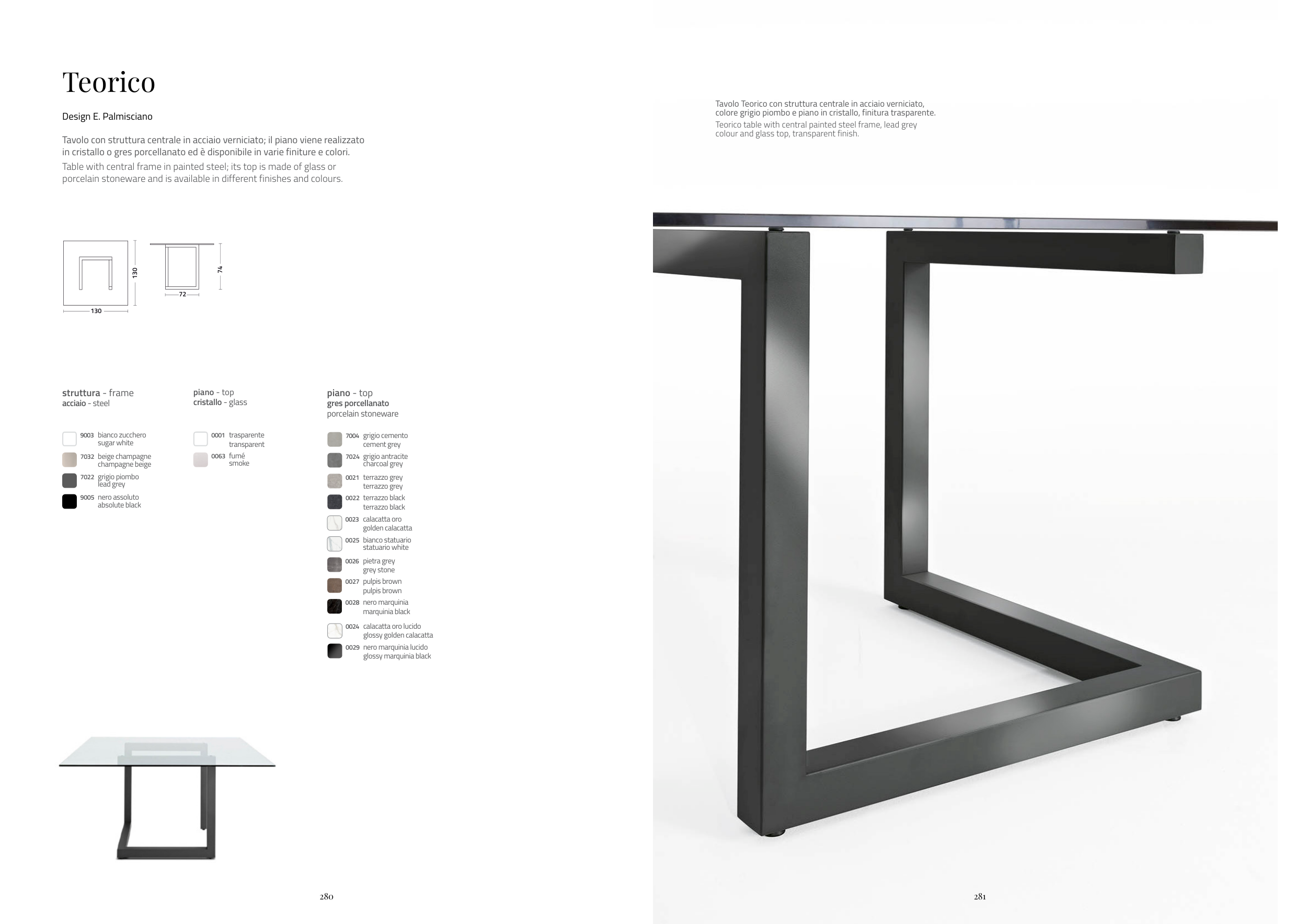 colore grigio piombo e piano in cristallo, finitura trasparente.