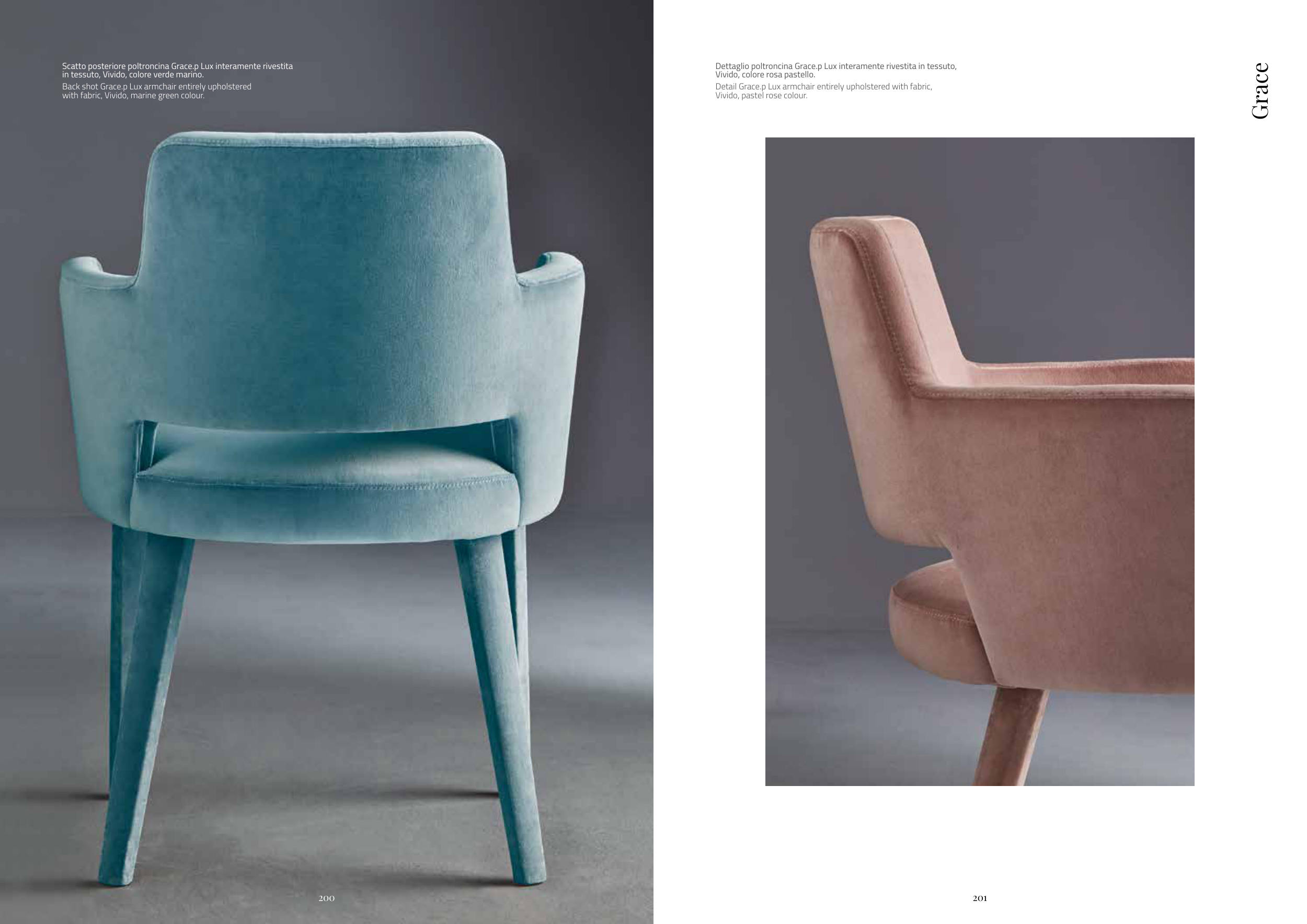 Dettaglio poltroncina Grace.p Lux interamente rivestita in tessuto,