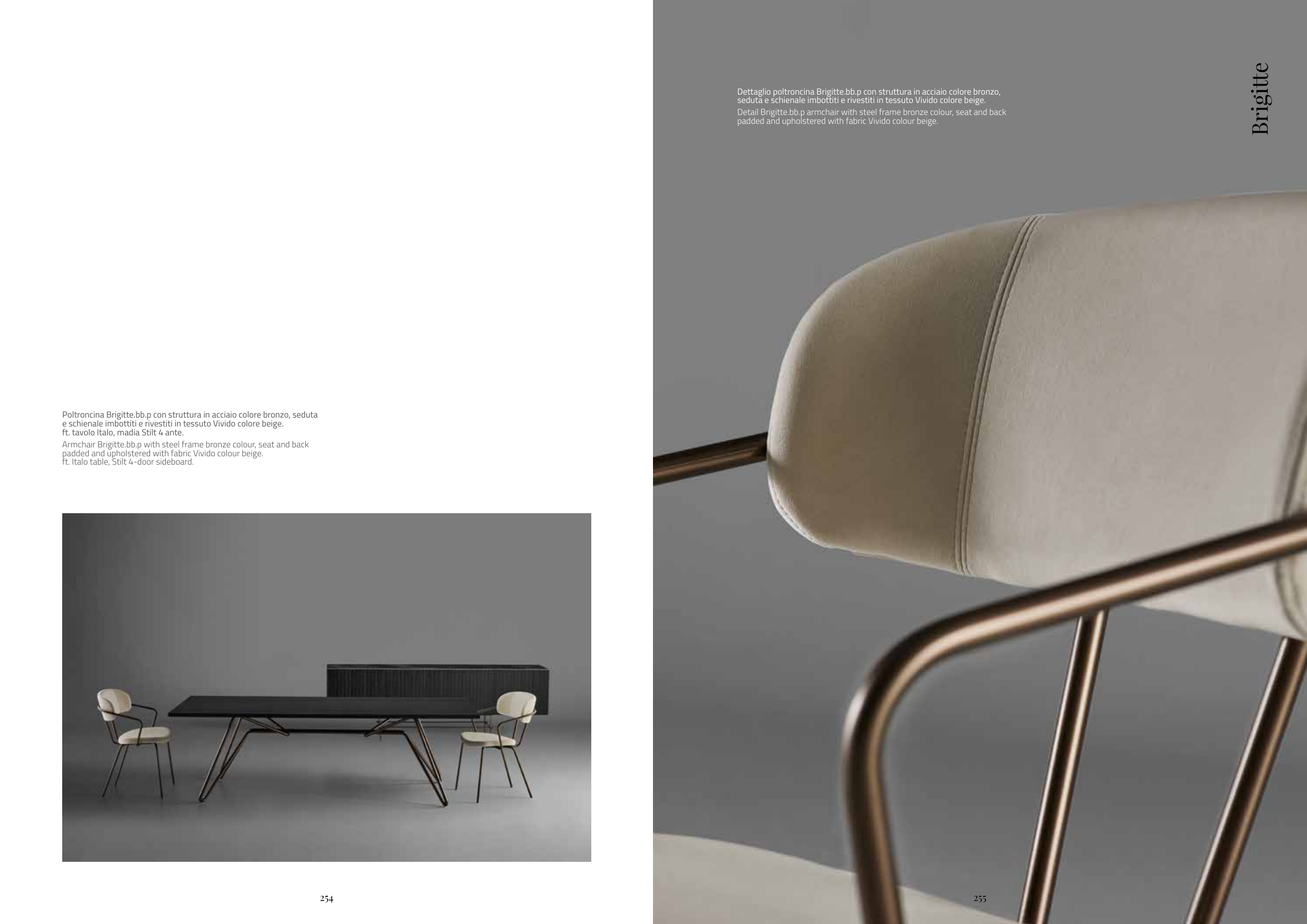 Dettaglio poltroncina Brigitte.bb.p con struttura in acciaio colore bronzo,
