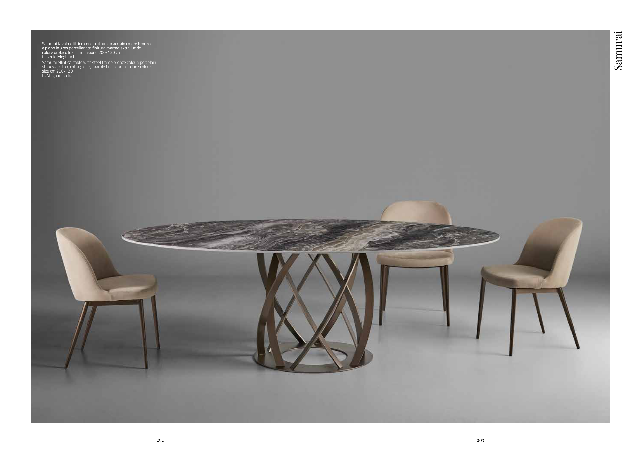 Samurai elliptical table with steel frame bronze colour; porcelain