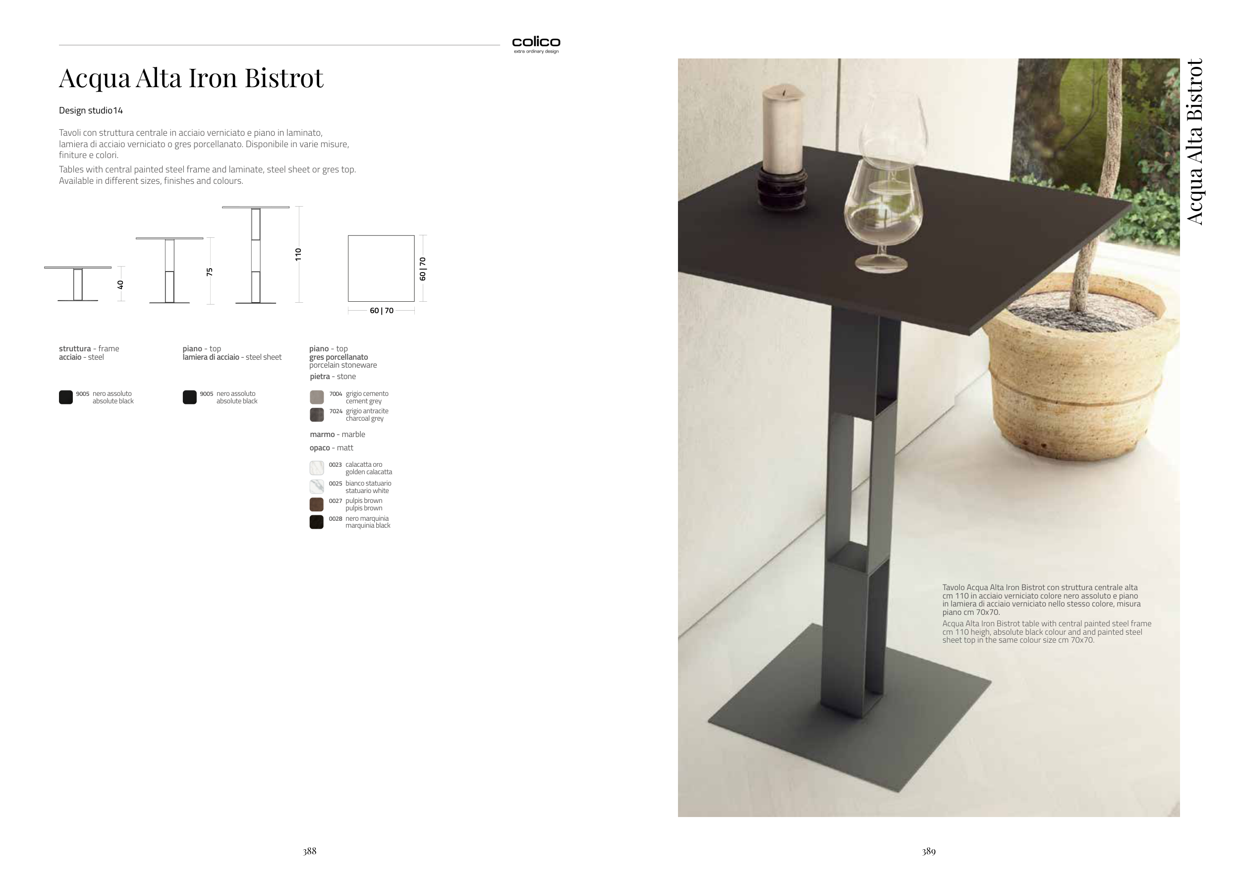 Tables with central painted steel frame and laminate, steel sheet or gres top.