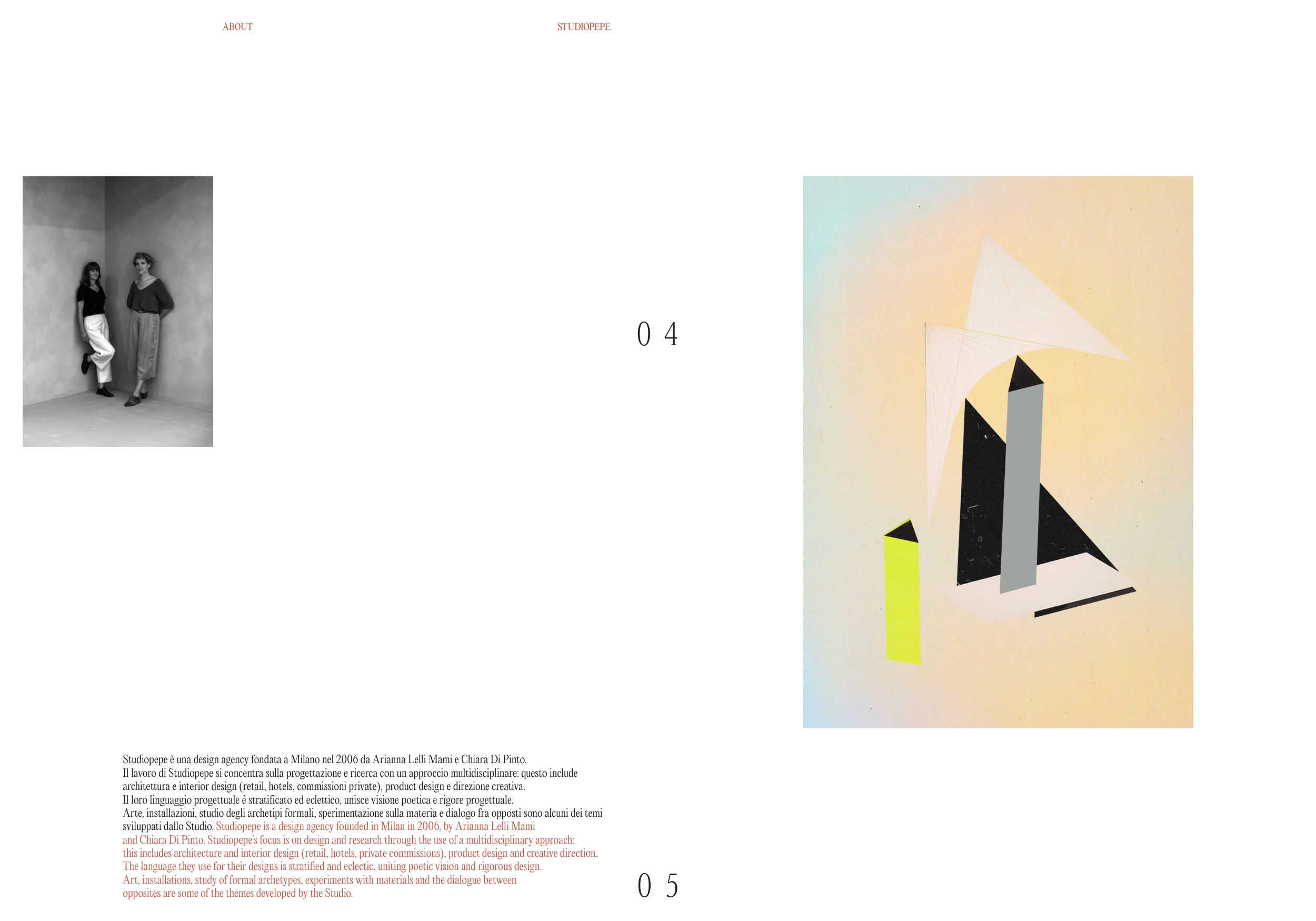 Studiopepe è una design agency fondata a Milano nel 2006 da Arianna Lelli Mami e Chiara Di Pinto.