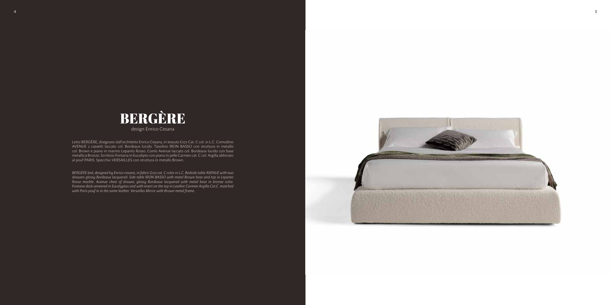 BERGÈRE bed, designed by Enrico cesana, in fabric G172 cat. C color 01 L.C. Bedside table AVENUE with two