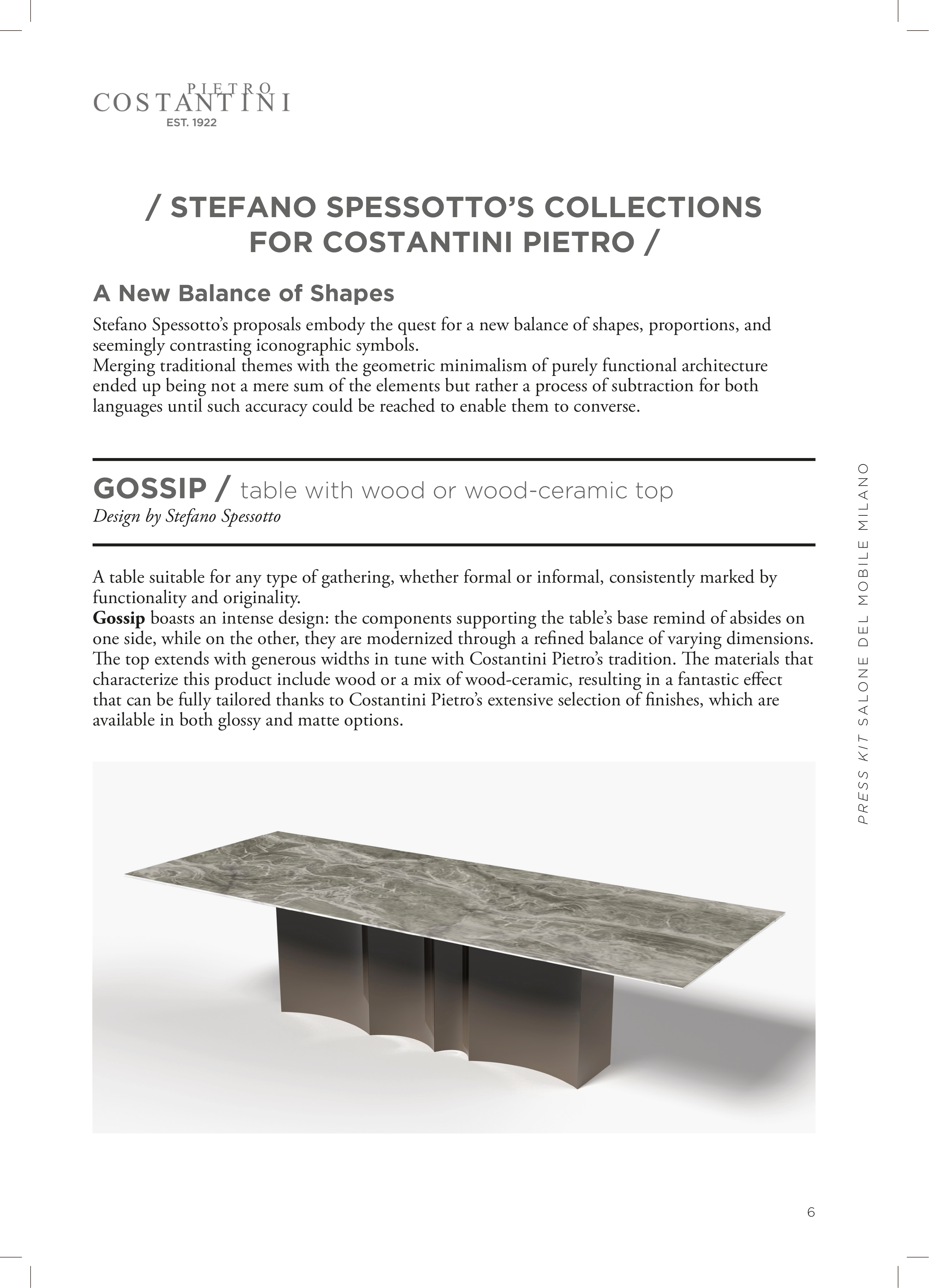Stefano Spessotto’s proposals embody the quest for a new balance of shapes, proportions, and