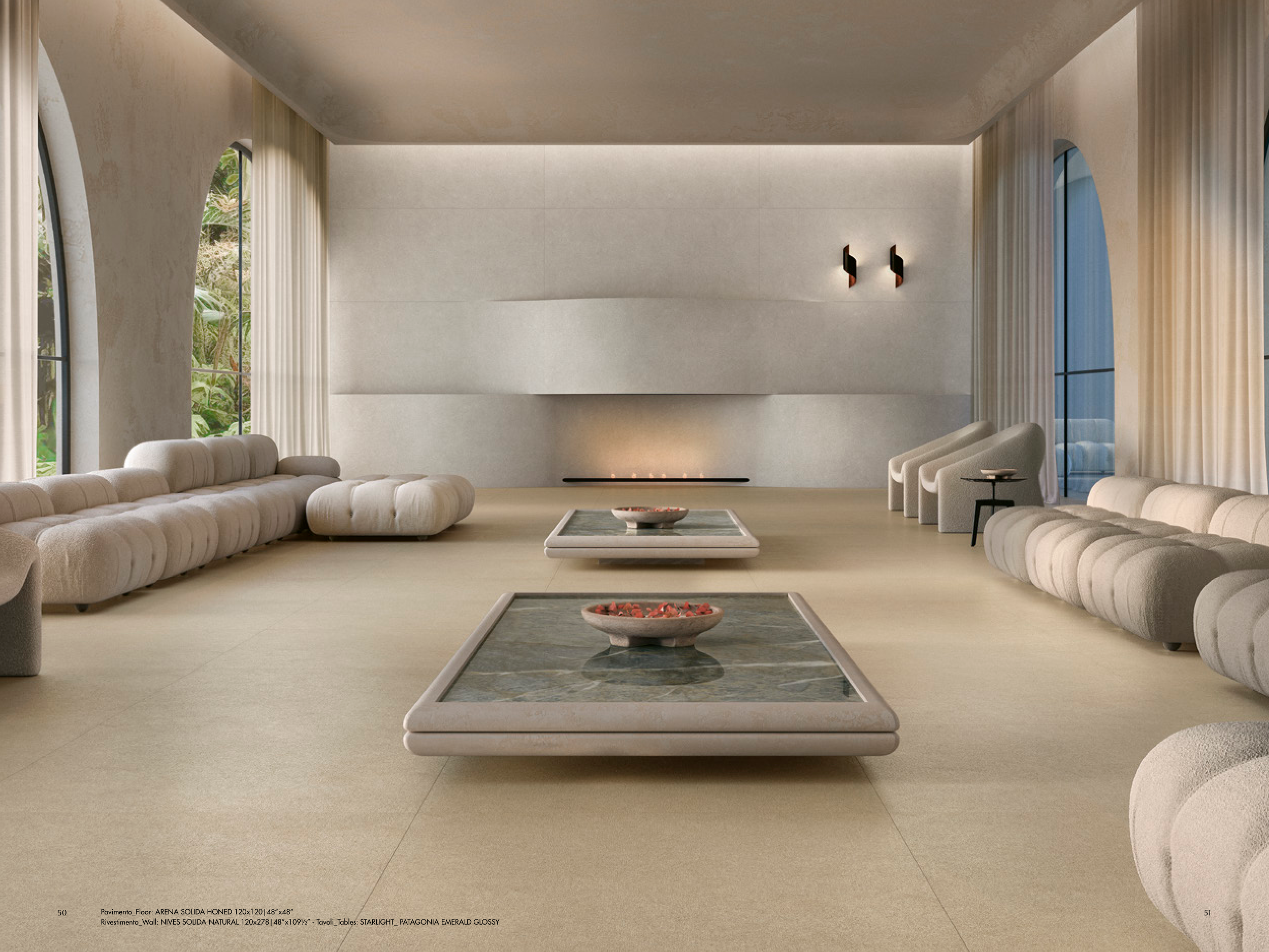 Rivestimento_Wall: NIVES SOLIDA NATURAL 120x278|48”x109½” - Tavoli_Tables: STARLIGHT_ PATAGONIA EMERALD GLOSSY