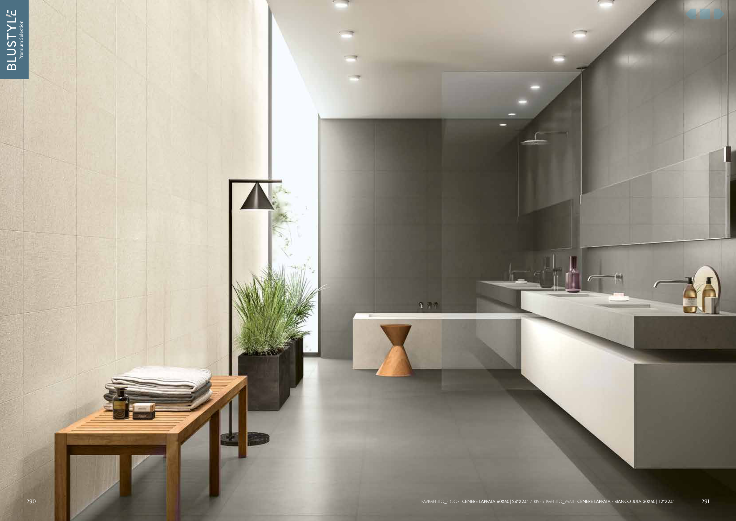 PAVIMENTO_FLOOR: CENERE LAPPATA 60X60|24”X24” / RIVESTIMENTO_WALL: CENERE LAPPATA - BIANCO JUTA 30X60|12”X24”