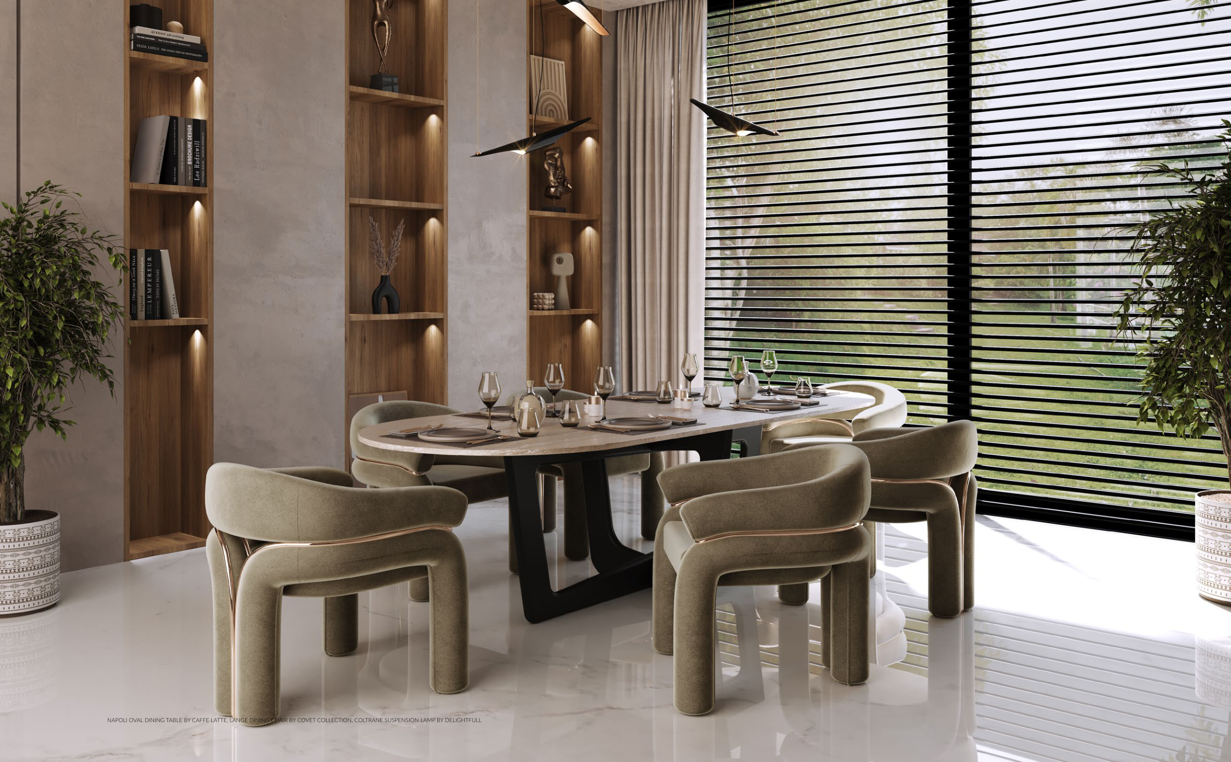 NAPOLI OVAL DINING TABLE BY CAFFE LATTE, LANGE DINING CHAIR BY COVET COLLECTION, COLTRANE SUSPENSION LAMP BY DELIGHTFULL