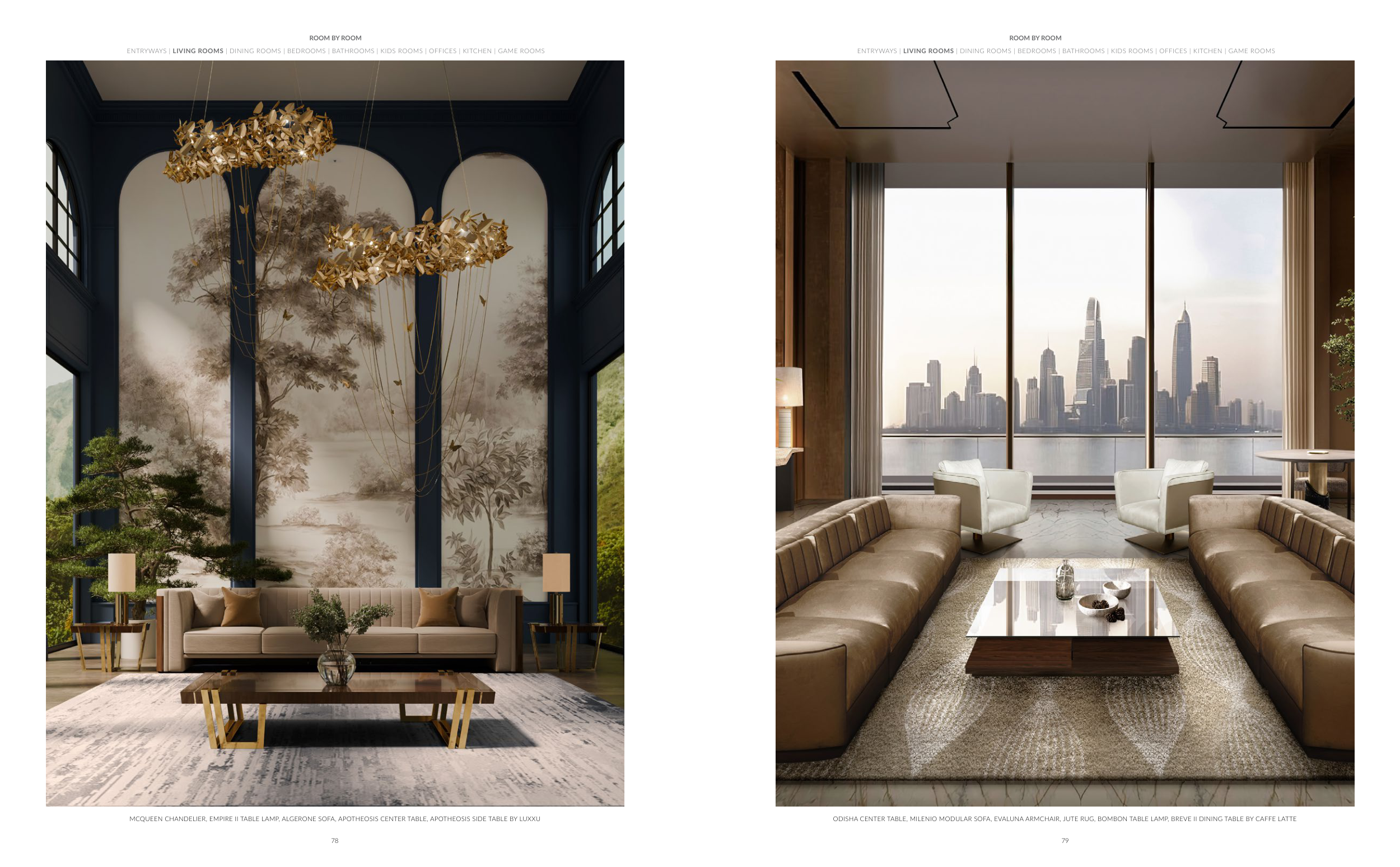 MCQUEEN CHANDELIER, EMPIRE II TABLE LAMP, ALGERONE SOFA, APOTHEOSIS CENTER TABLE, APOTHEOSIS SIDE TABLE BY LUXXU
