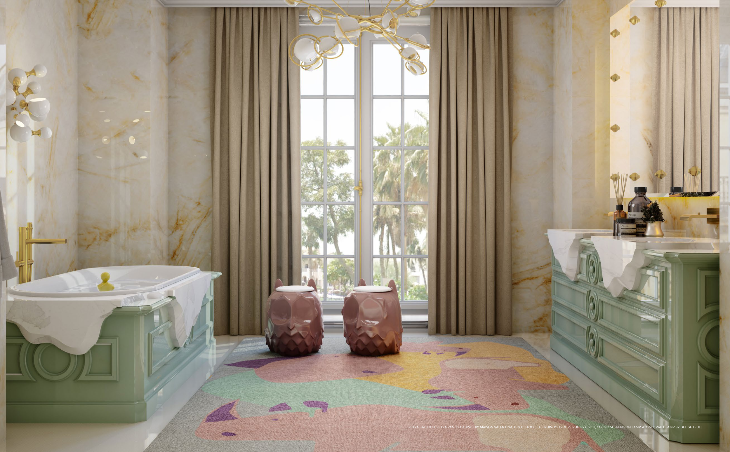 PETRA BATHTUB, PETRA VANITY CABINET BY MAISON VALENTINA, HOOT STOOL, THE RHINO’S TROUPE RUG BY CIRCU, COSMO SUSPENSION LAMP, ATOMIC WALL LAMP BY DELIGHTFULL
