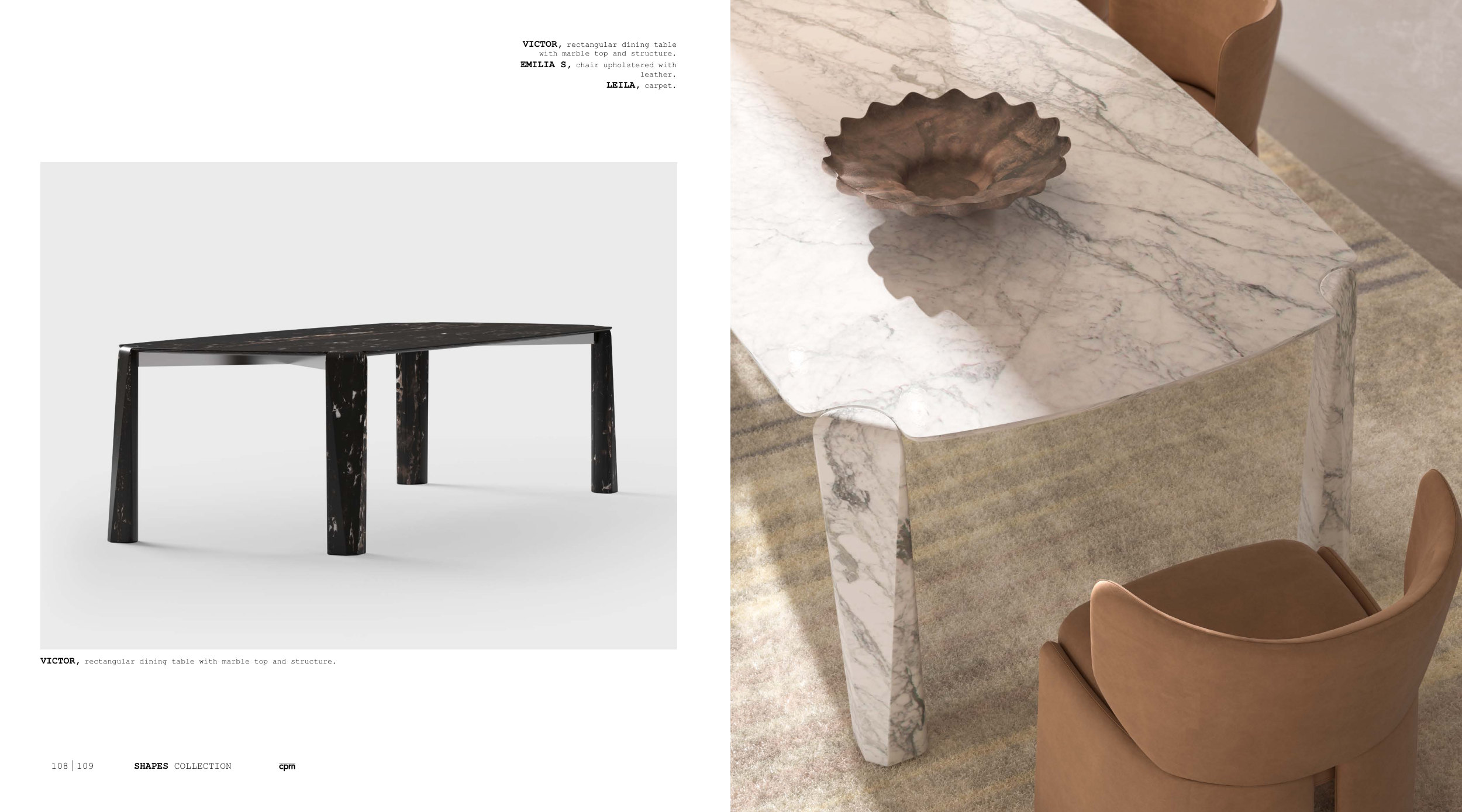 VICTOR, rectangular dining table with marble top and structure.