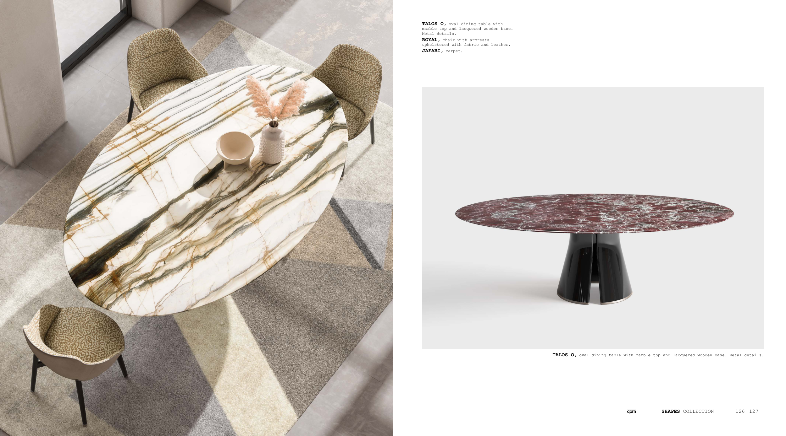 TALOS O, oval dining table with marble top and lacquered wooden base. Metal details.