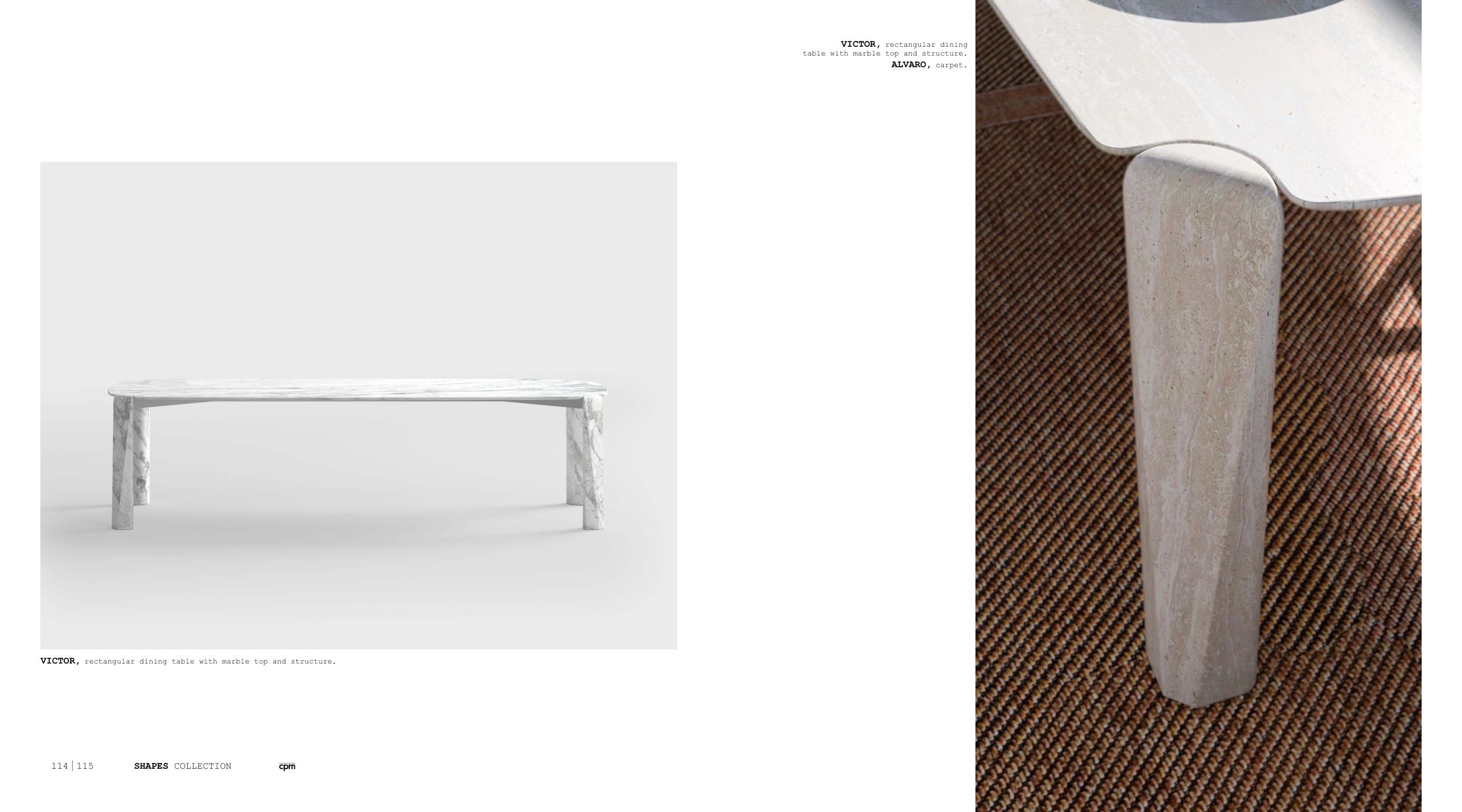 VICTOR, rectangular dining table with marble top and structure.