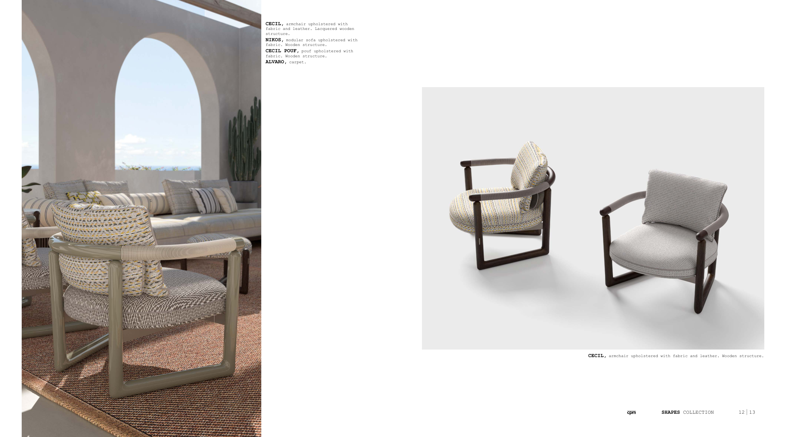 CECIL, armchair upholstered with fabric and leather. Wooden structure.