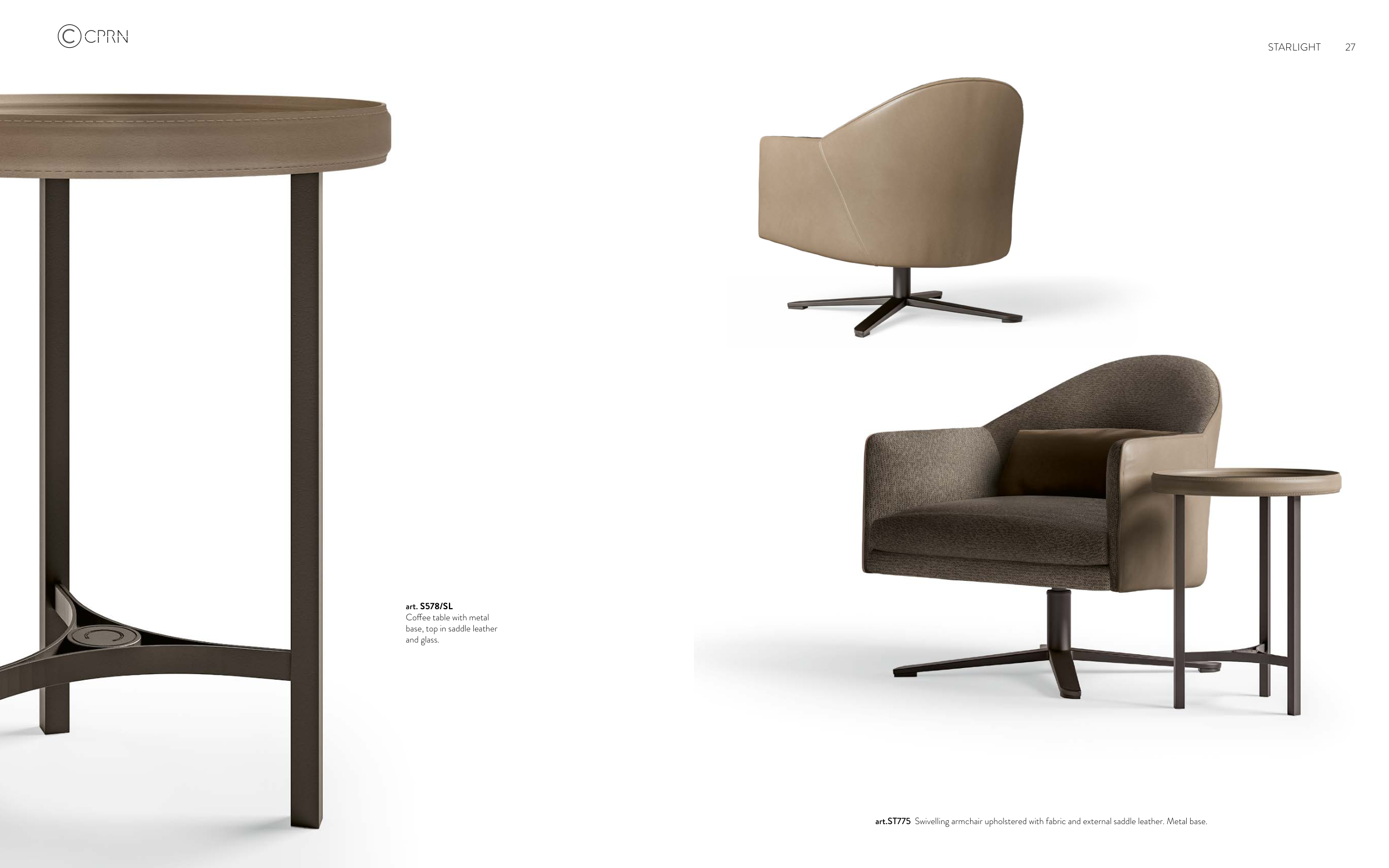 art.ST775 Swivelling armchair upholstered with fabric and external saddle leather. Metal base.