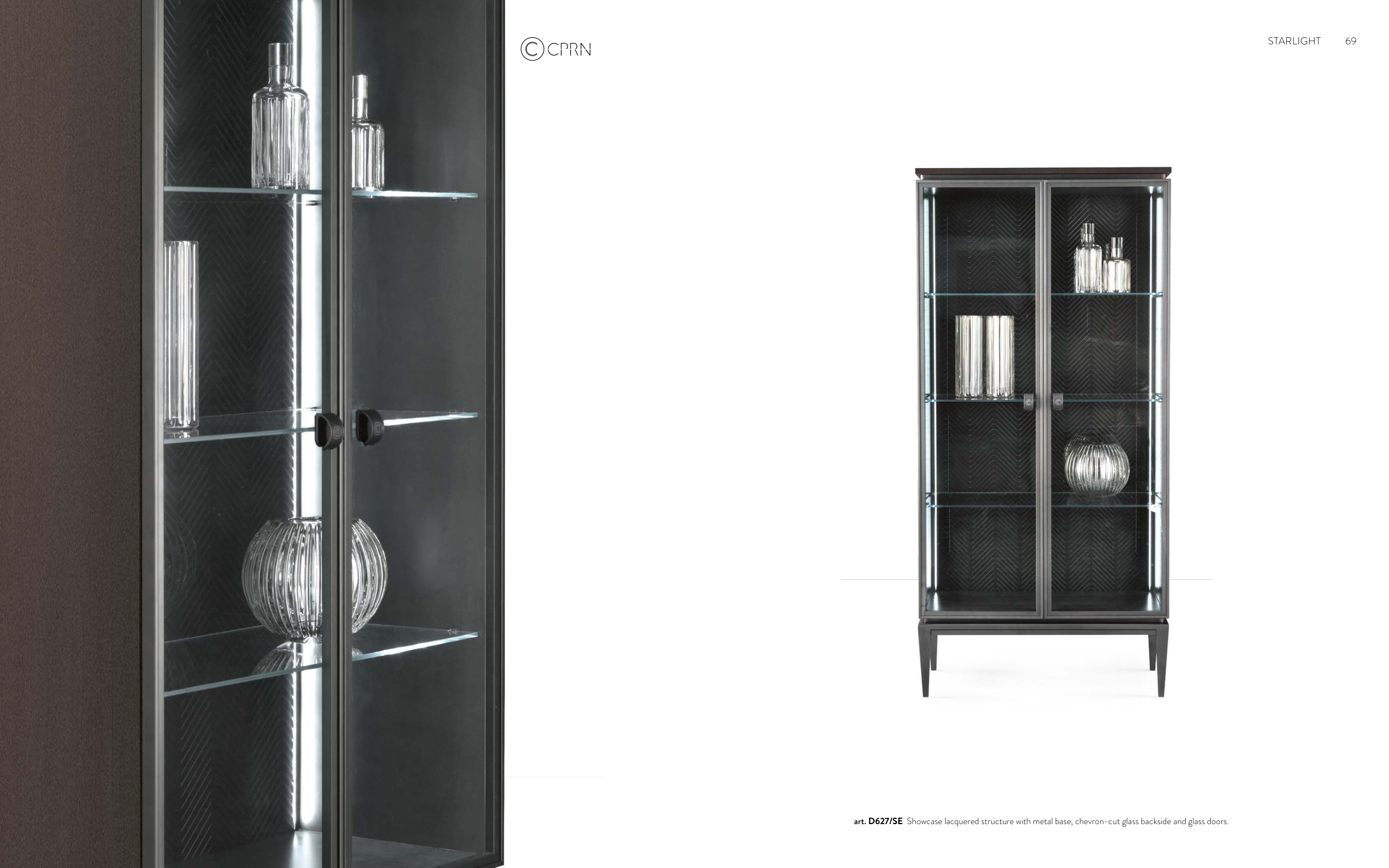 art. D627/SE Showcase lacquered structure with metal base, chevron-cut glass backside and glass doors.