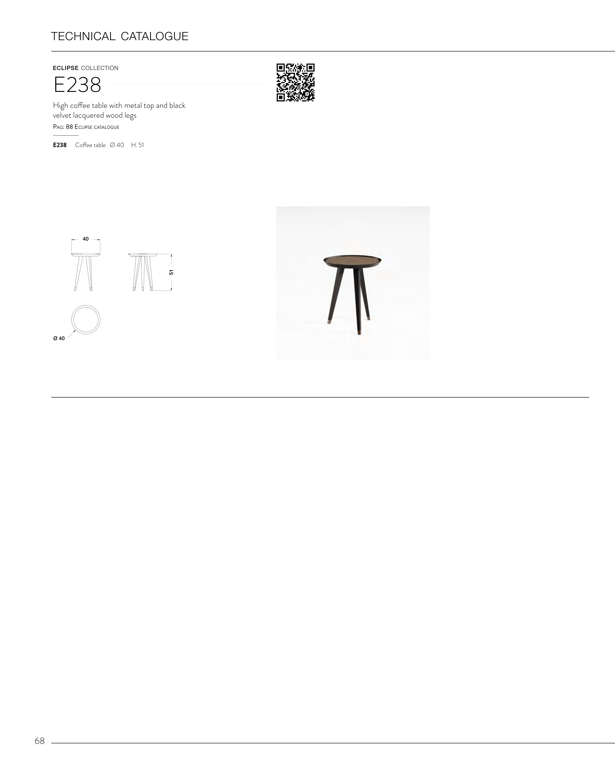 510 400 400 Tavolino alto Cliente: CIAC Modello: Collez.: AR SCALA 1:150 40 Ø 40 51 68 technical catalogue High coffee table with metal top and black velvet lacquered wood legs Pag: 88 ecliPSe catalogue E238 E238 Coffee table Ø 40 H. 51 eclipse collection