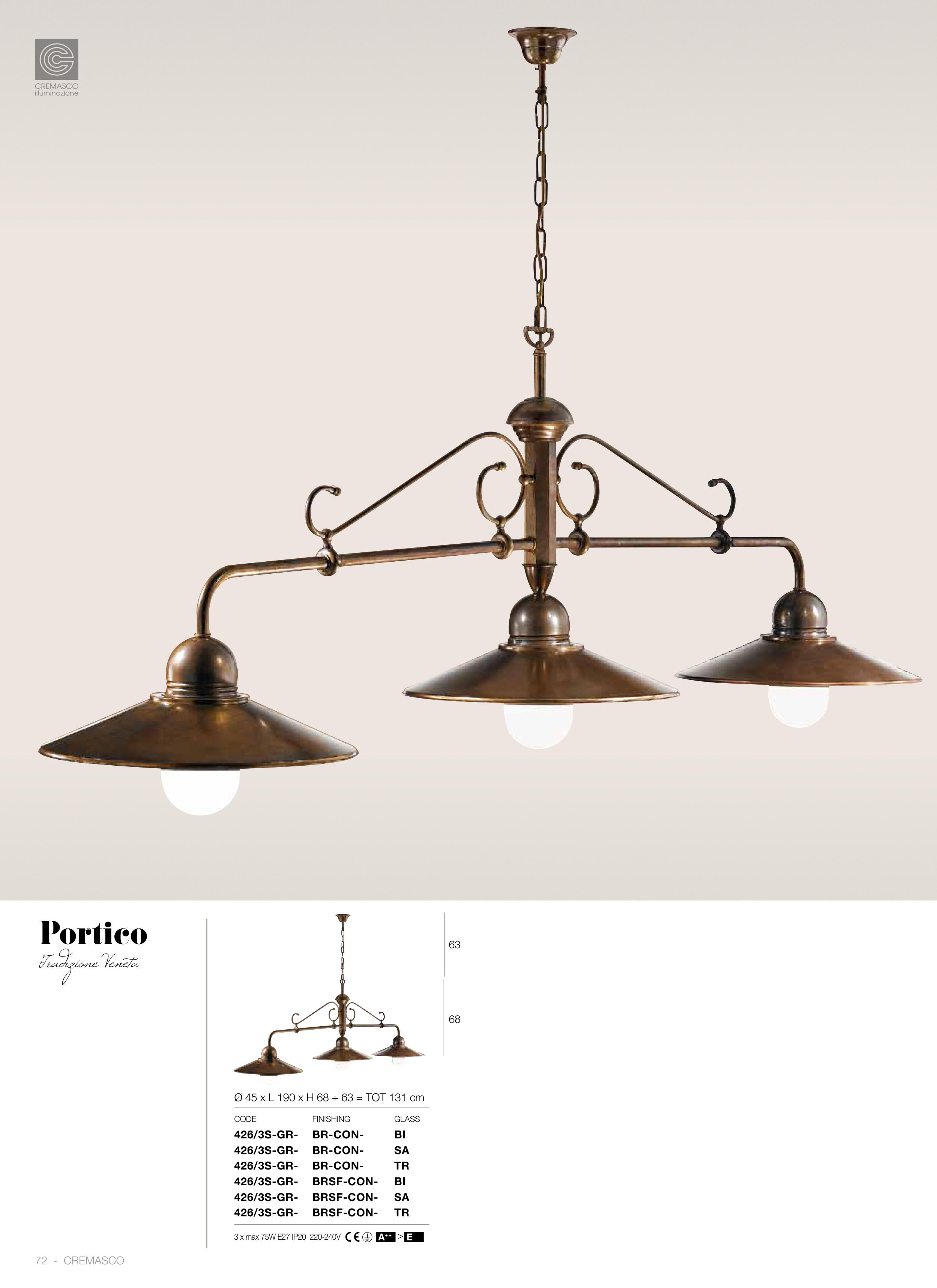 Ø 45 x L 190 x H 68 + 63 = TOT 131 cm CODE FINISHING GLASS 426/3S-GR- BR-CON- BI 426/3S-GR- BR-CON- SA 426/3S-GR- BR-CON- TR 426/3S-GR- BRSF-CON- BI 426/3S-GR- BRSF-CON- SA 426/3S-GR- BRSF-CON- TR 3 x max 75W E27 IP20 220-240V A++ E > 68 63 72 - CREMASCO