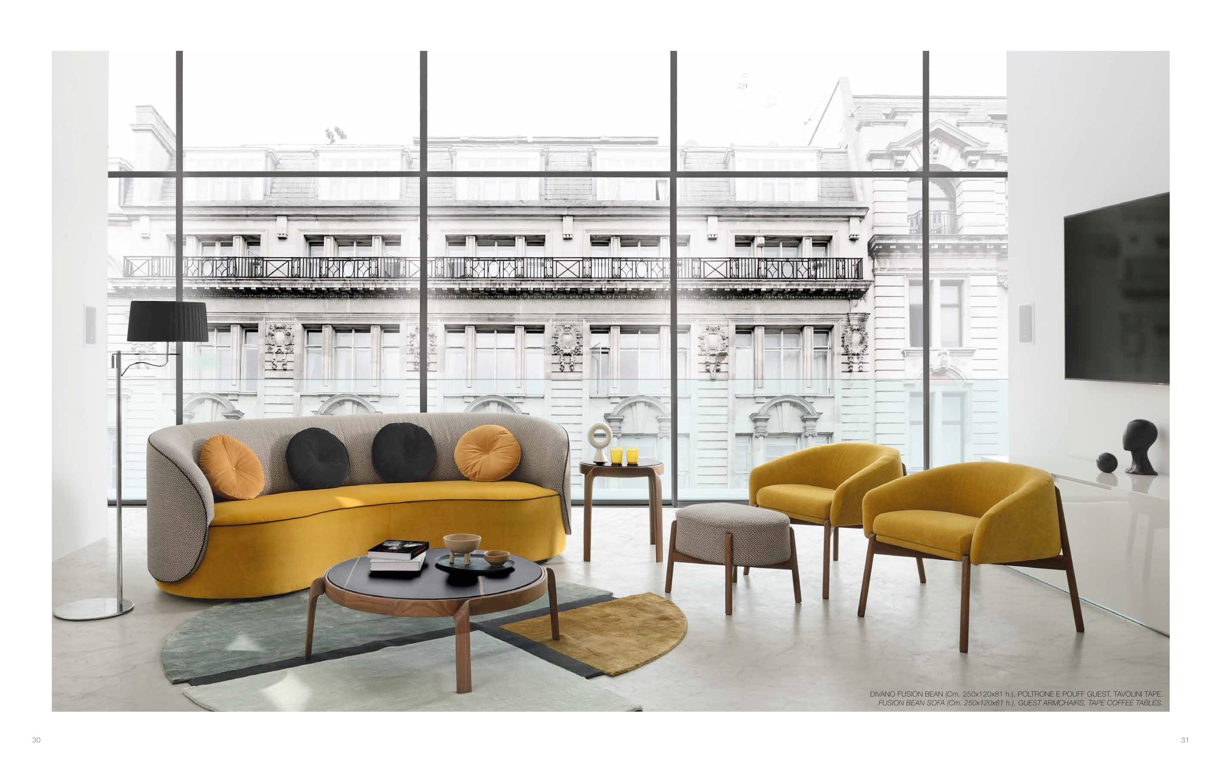 FUSION BEAN SOFA (Cm. 250x120x81 h.), GUEST ARMCHAIRS, TAPE COFFEE TABLES.