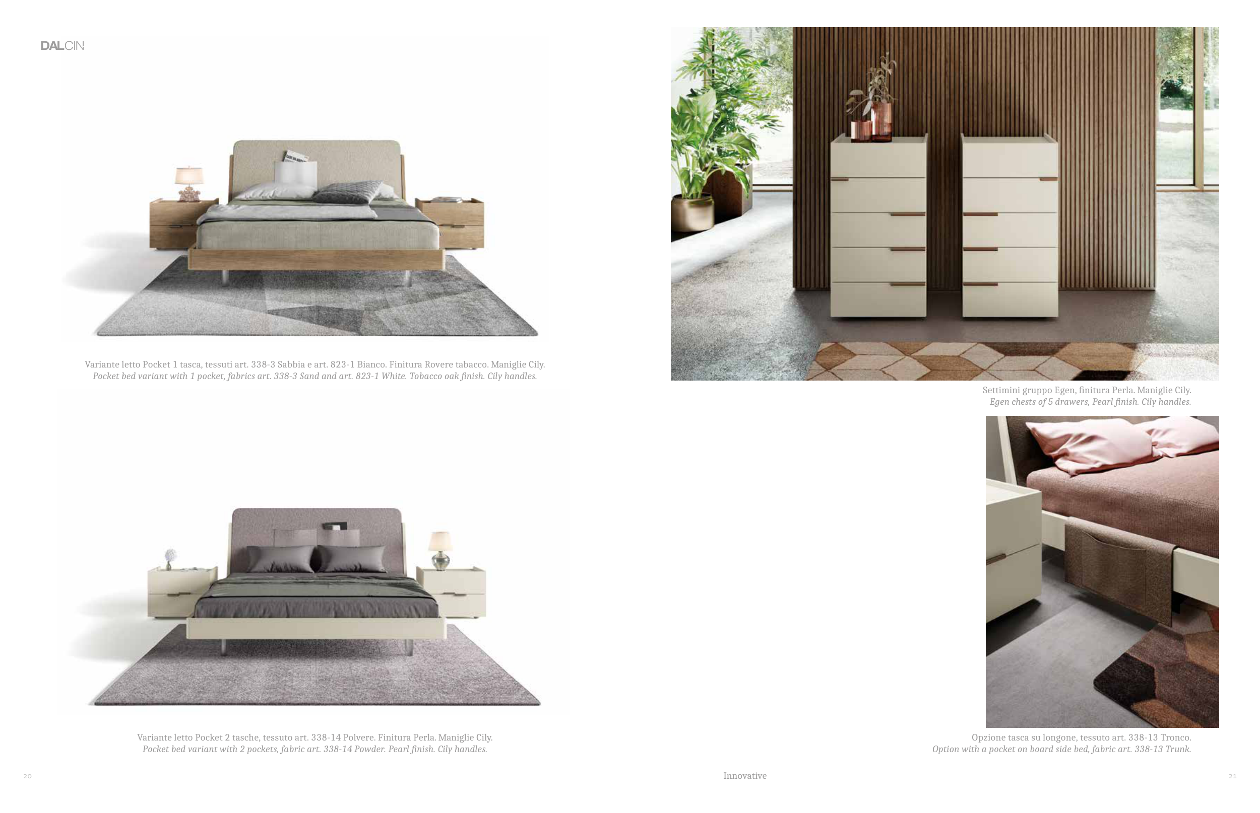 Variante letto Pocket 2 tasche, tessuto art. 338-14 Polvere. Finitura Perla. Maniglie Cily.