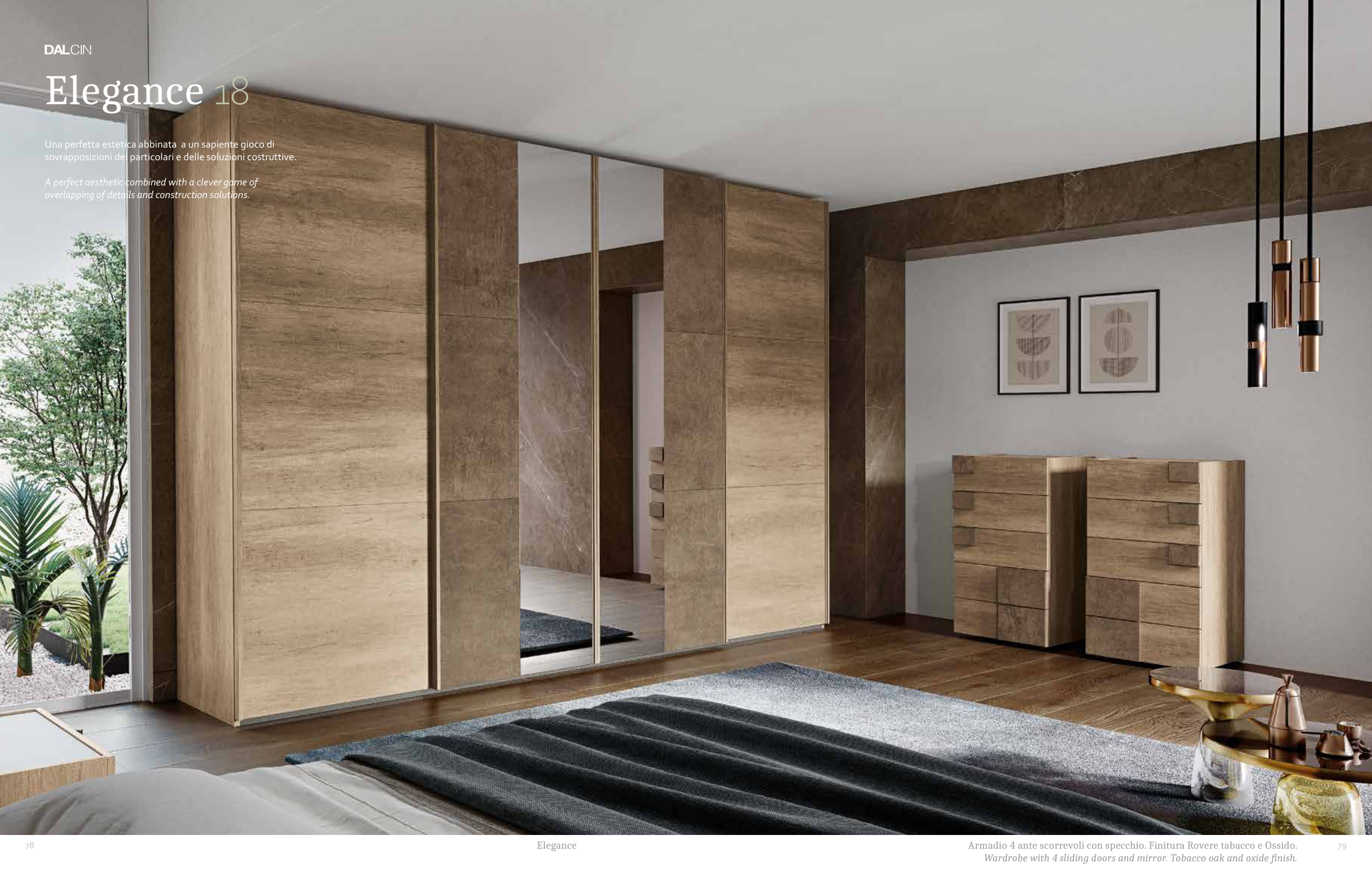 Armadio 4 ante scorrevoli con specchio. Finitura Rovere tabacco e Ossido.
