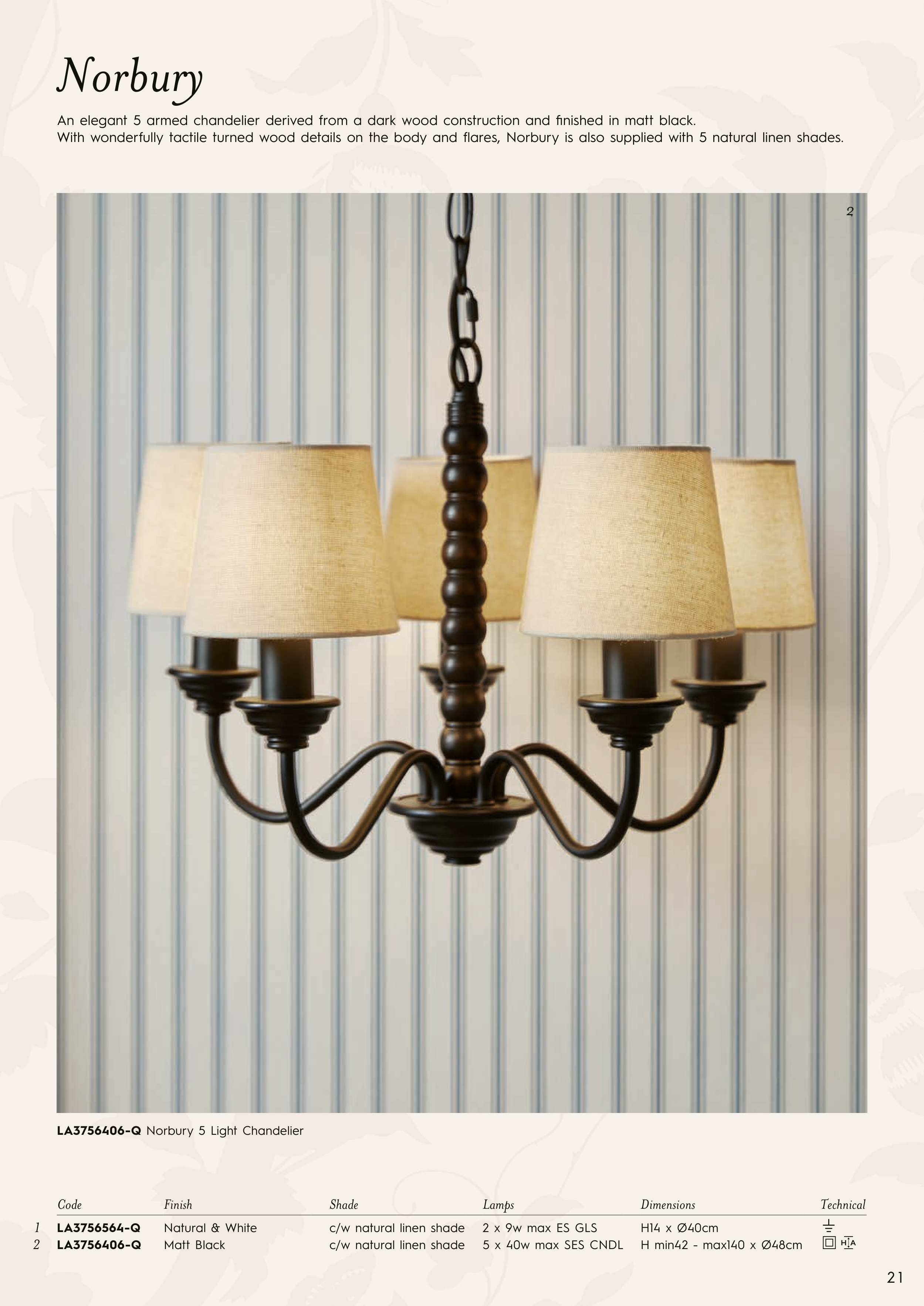 With wonderfully tactile turned wood details on the body and fl ares, Norbury is also supplied with 5 natural linen shades.
