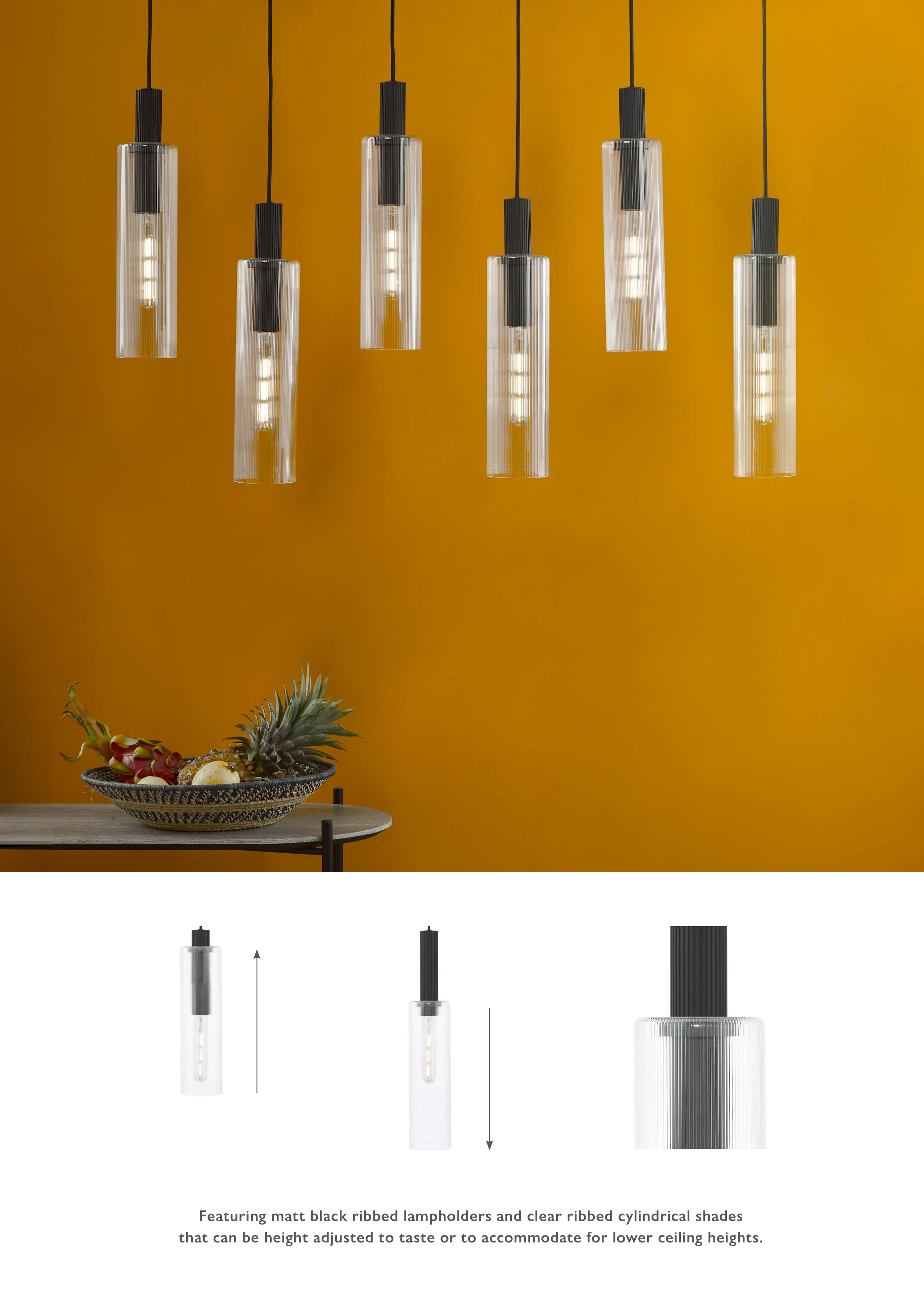 Featuring matt black ribbed lampholders and clear ribbed cylindrical shades