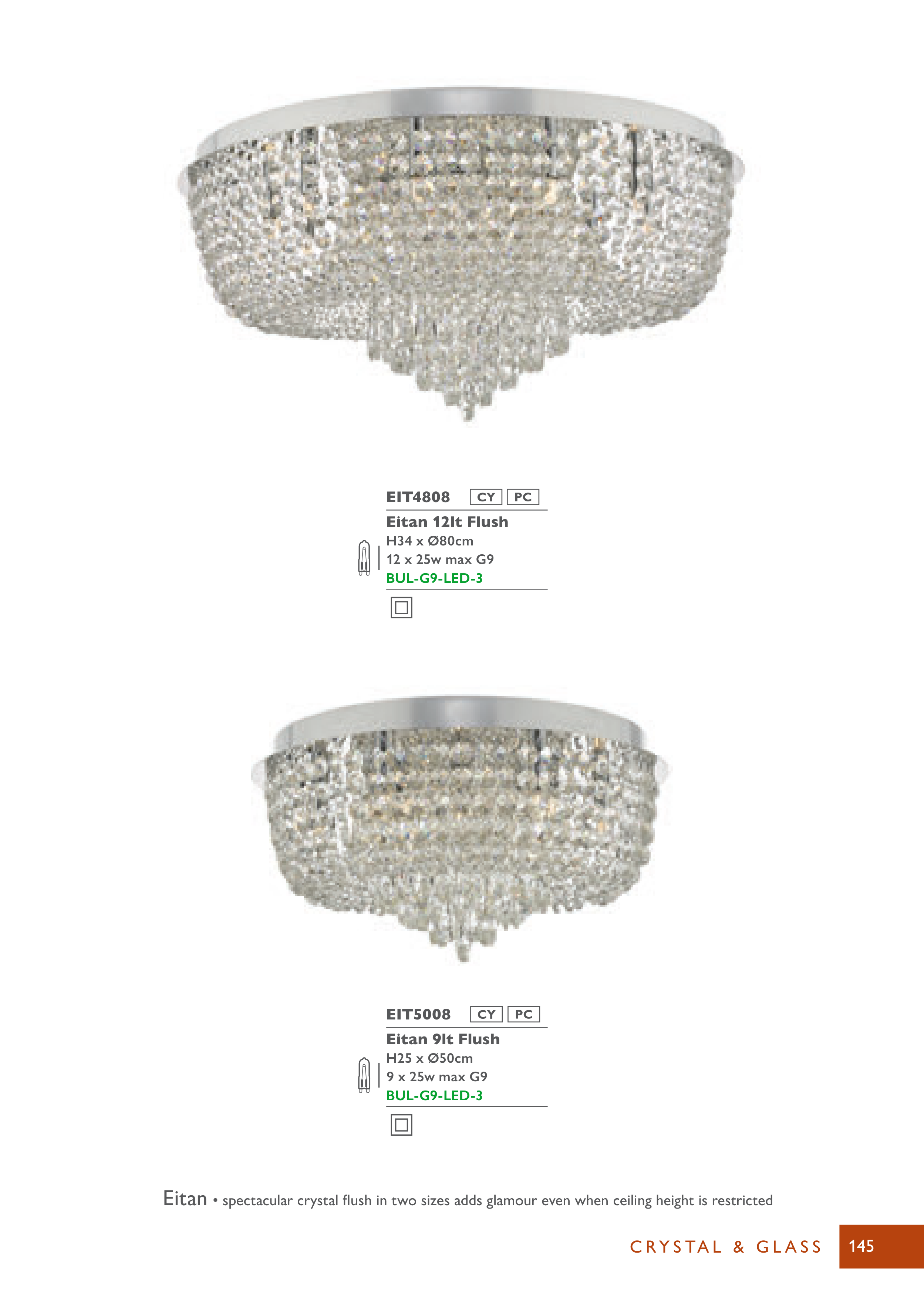 • spectacular crystal fl ush in two sizes adds glamour even when ceiling height is restricted