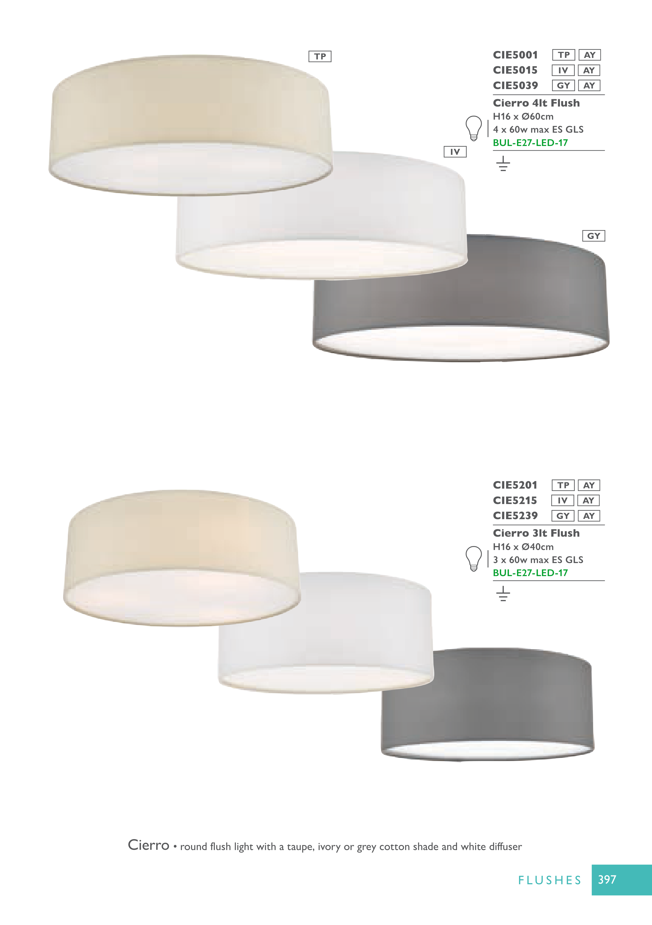 • round flush light with a taupe, ivory or grey cotton shade and white diffuser