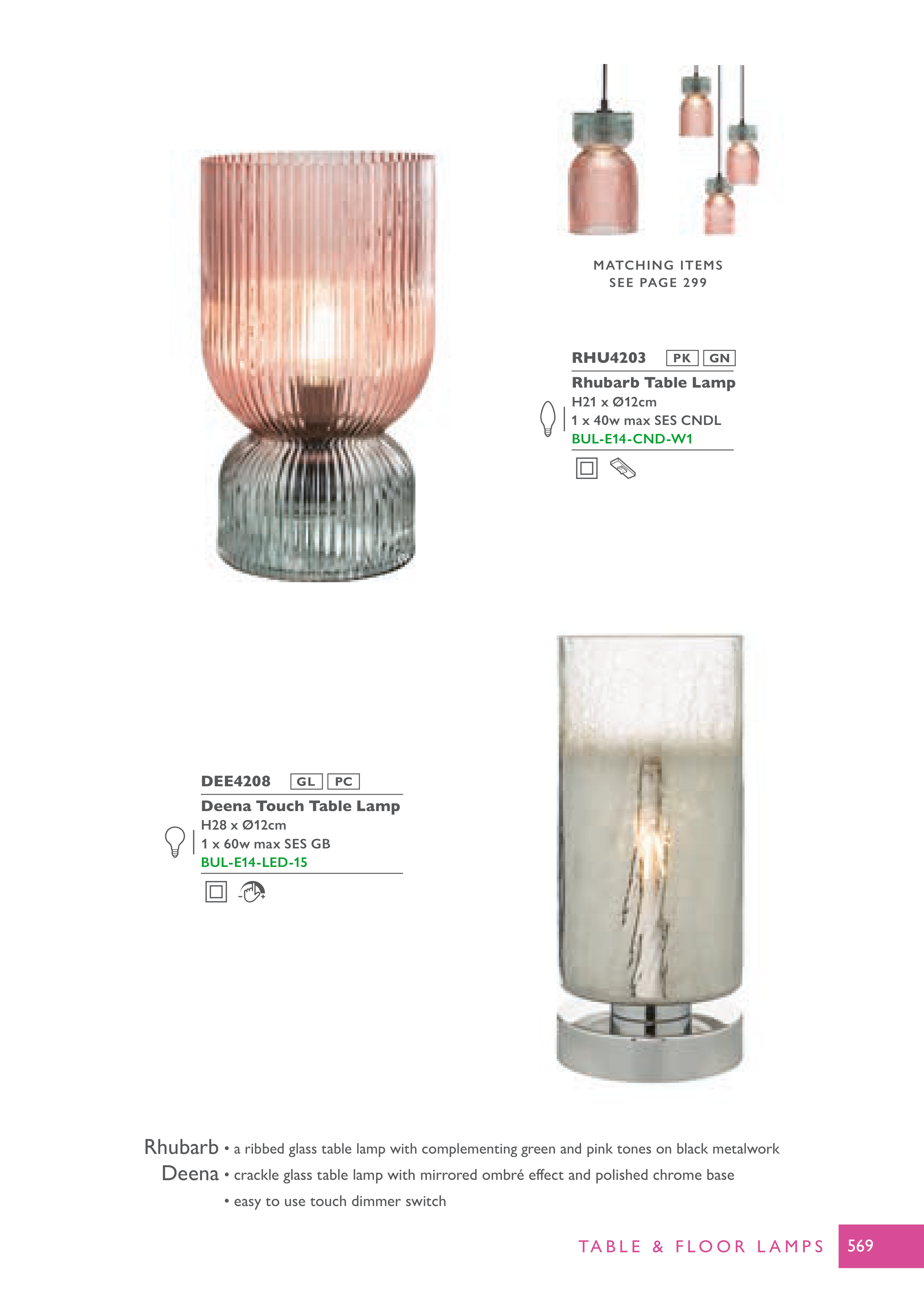 • a ribbed glass table lamp with complementing green and pink tones on black metalwork