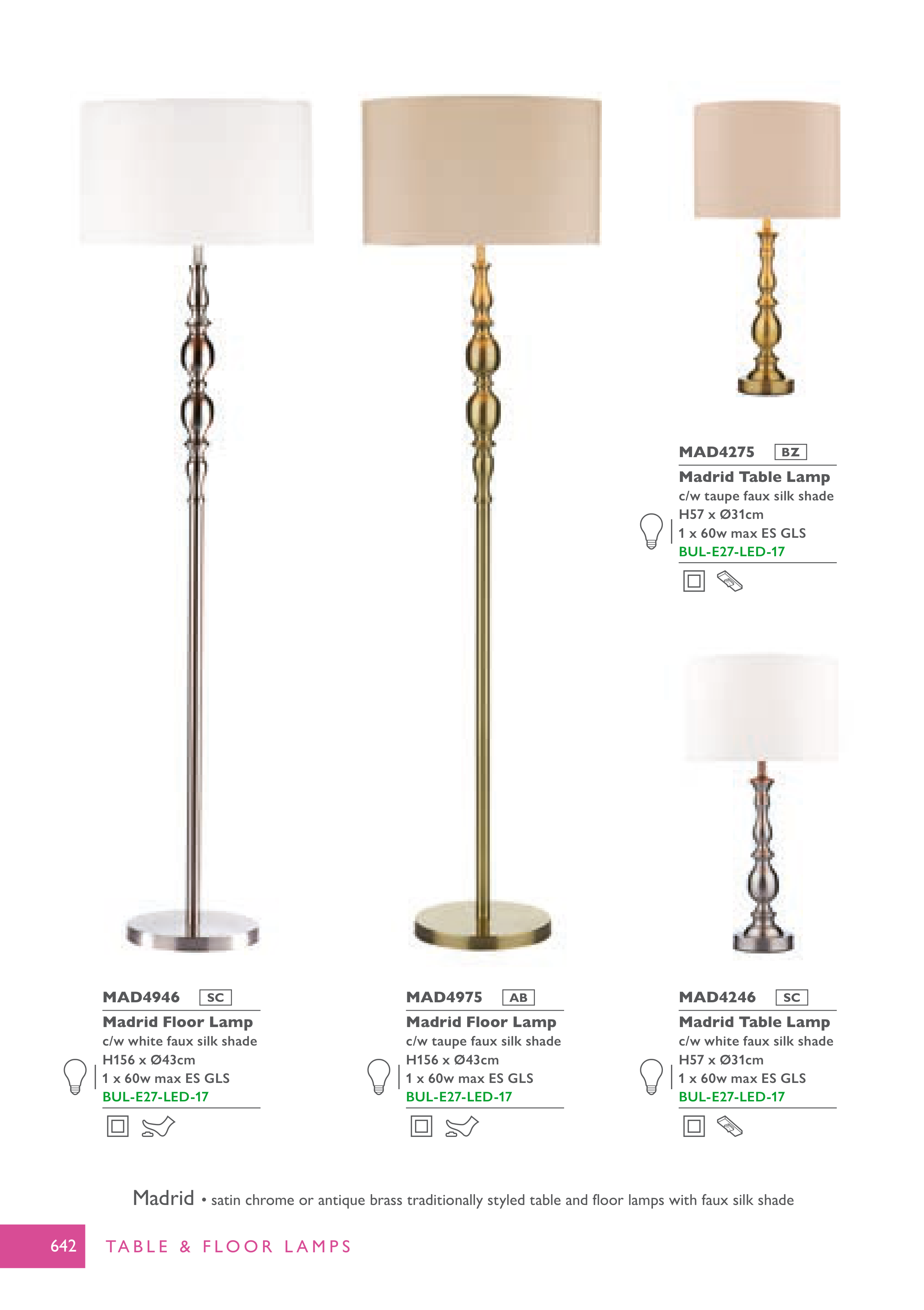 • satin chrome or antique brass traditionally styled table and floor lamps with faux silk shade