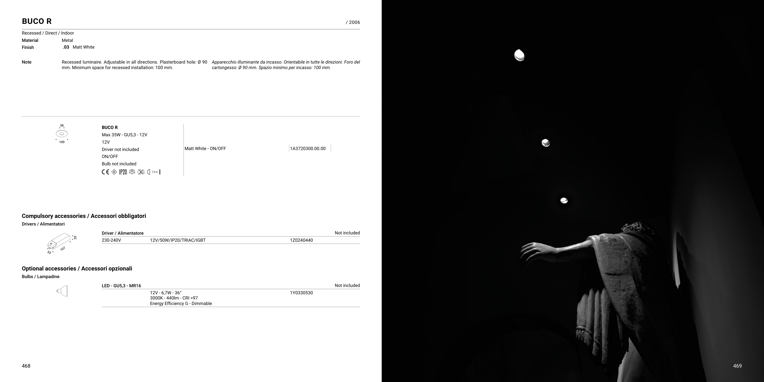 Recessed luminaire. Adjustable in all directions. Plasterboard hole: Ø 90