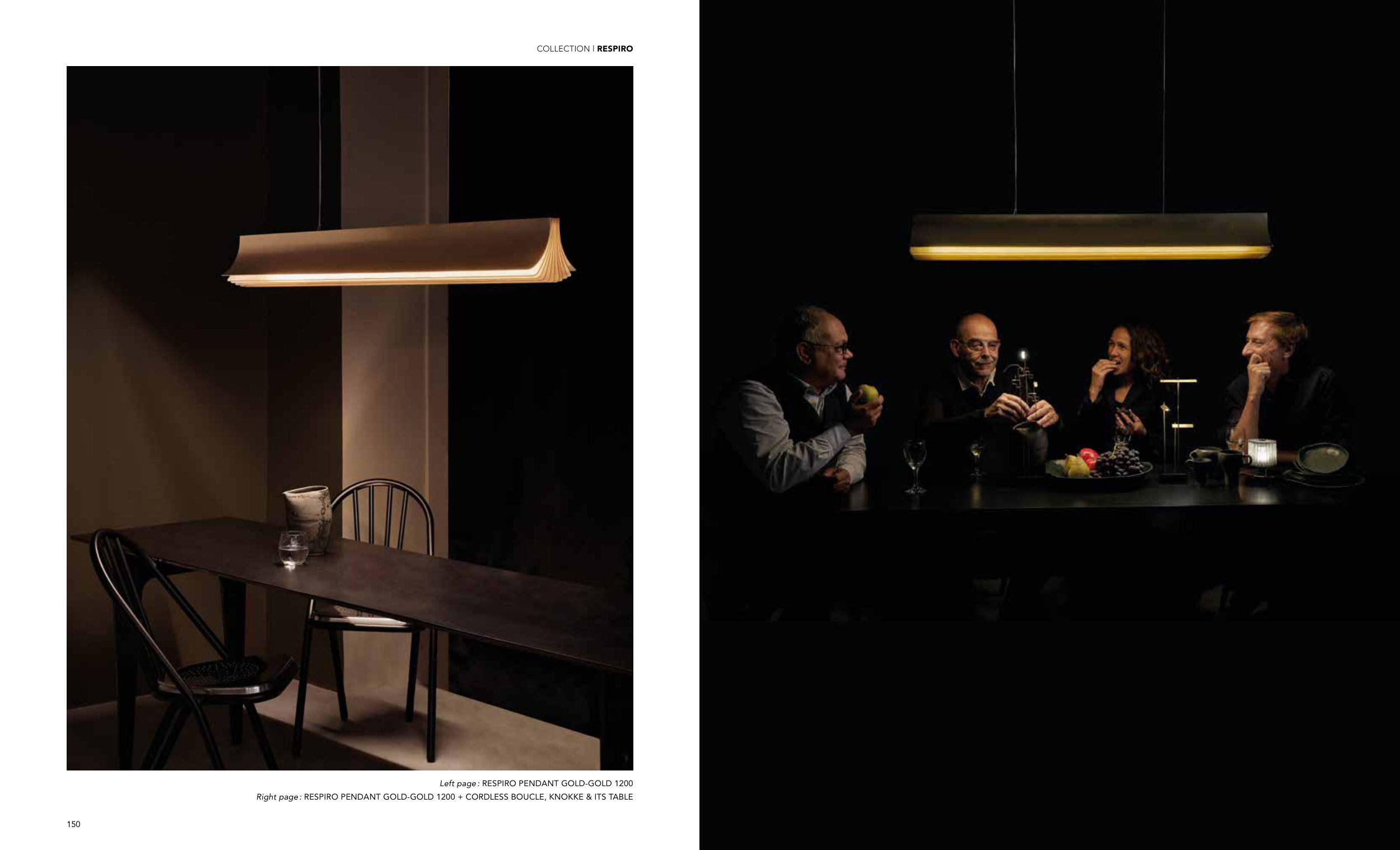 Right page : RESPIRO PENDANT GOLD-GOLD 1200 + CORDLESS BOUCLE, KNOKKE & ITS TABLE