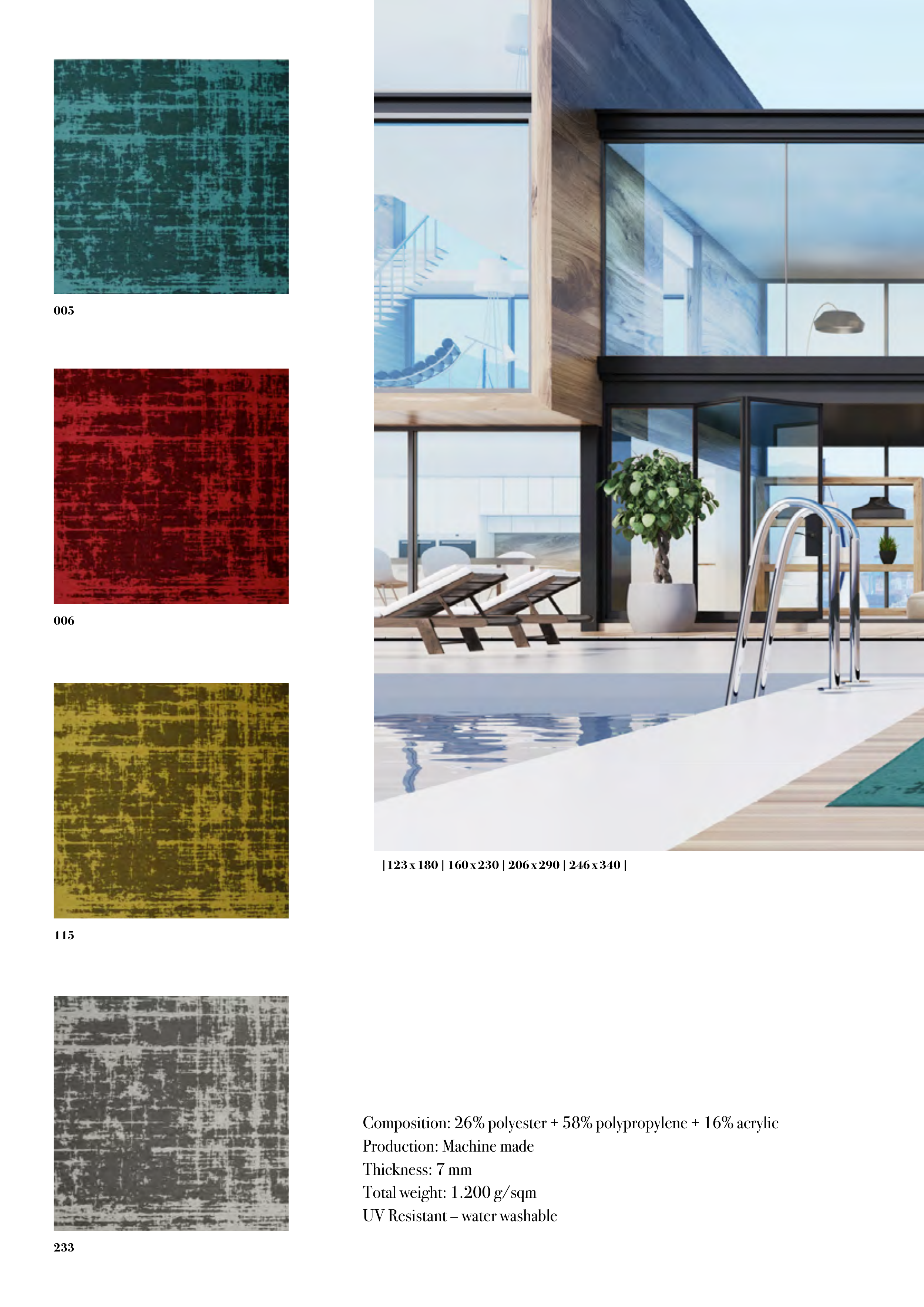 Composition: 26% polyester + 58% polypropylene + 16% acrylic
