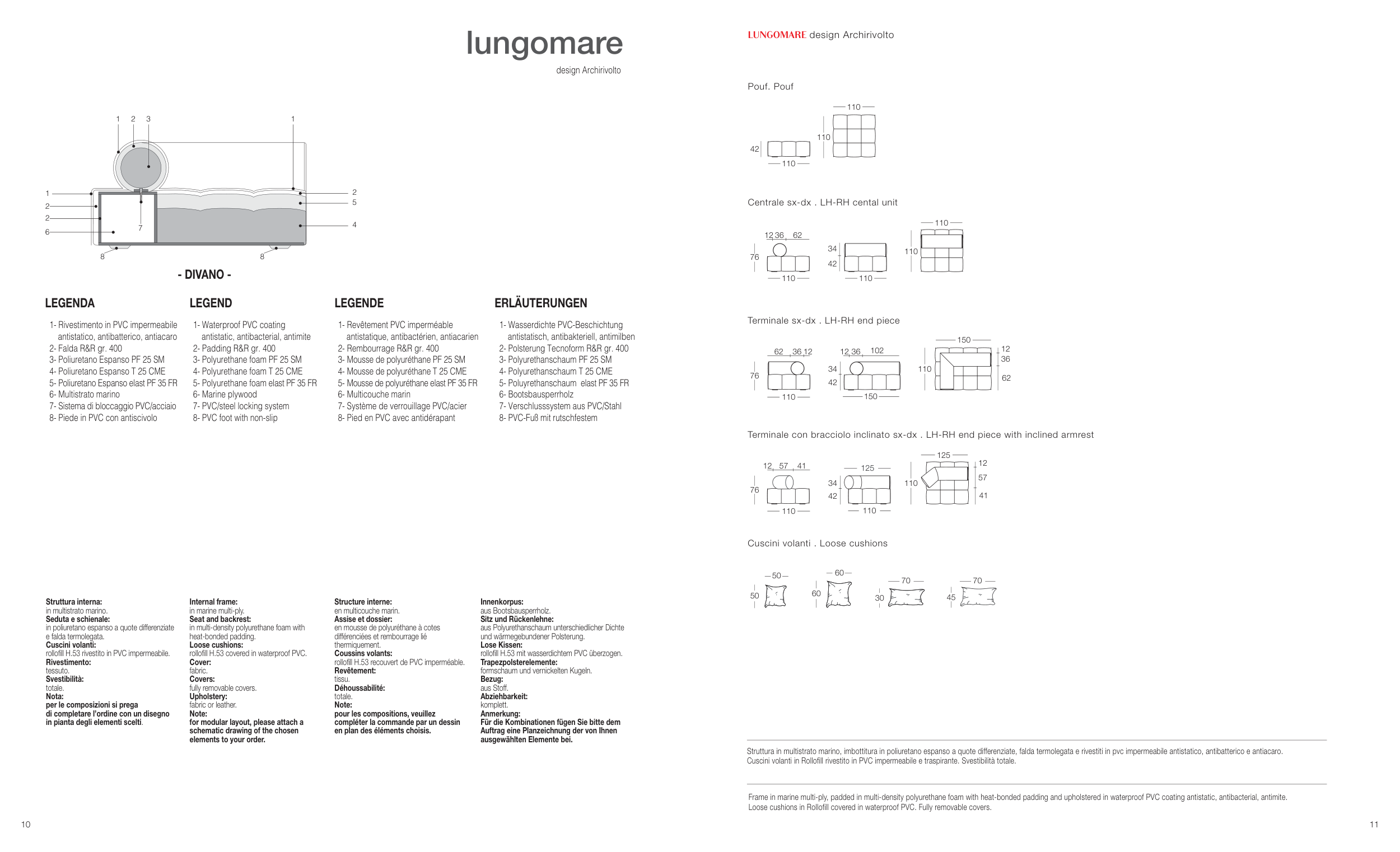 Frame in marine multi-ply, padded in multi-density polyurethane foam with heat-bonded padding and upholstered in waterproof PVC coating antistatic, antibacterial, antimite.