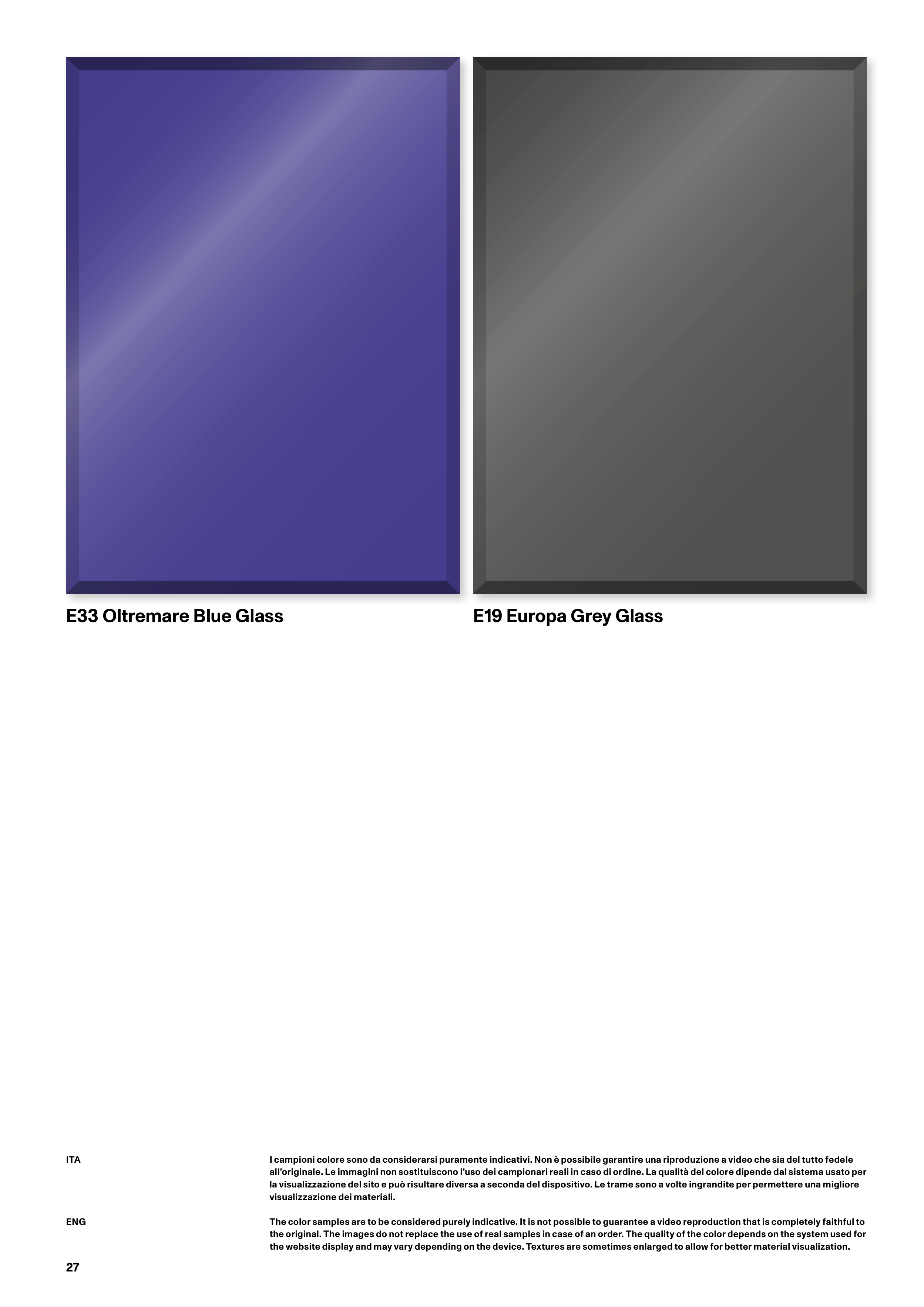 The color samples are to be considered purely indicative. It is not possible to guarantee a video reproduction that is completely faithful to