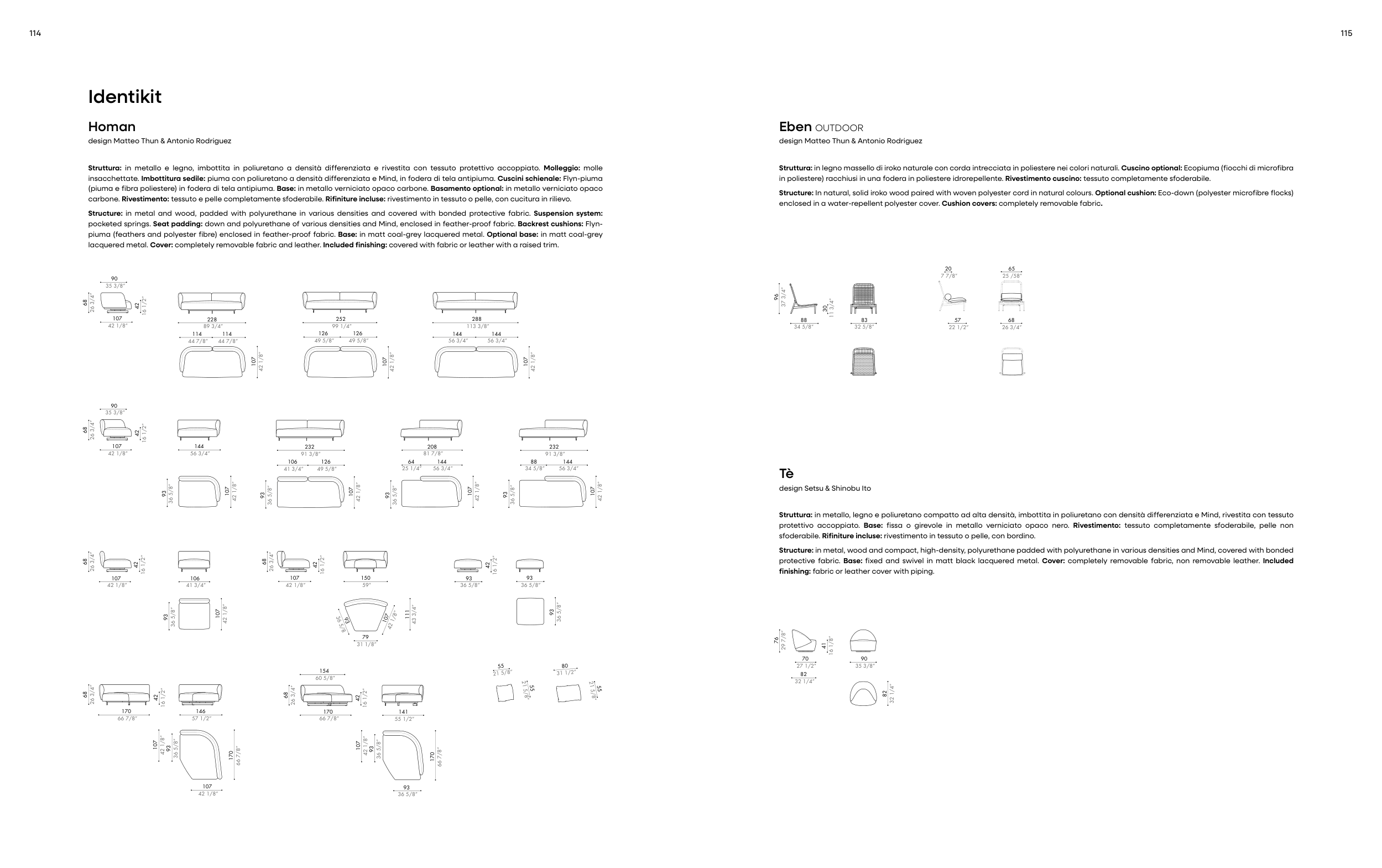 Structure: in metal and wood, padded with polyurethane in various densities and covered with bonded protective fabric. Suspension system: